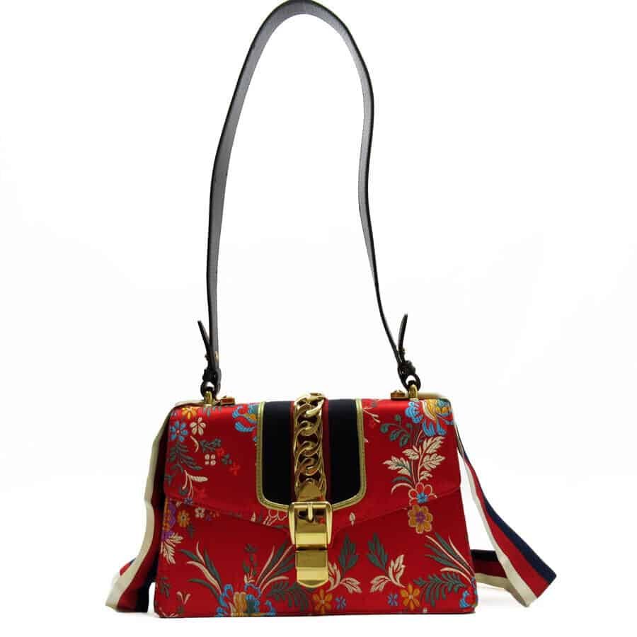 Elevate your style with the Gucci Sylvie Shoulder Bag in a vibrant red and multicolor satin and leather combination. This iconic piece features the signature web stripe and gold chain detail for a touch of luxury. The adjustable shoulder strap allows for versatile wear, perfect for any occasion. With its spacious interior and timeless design, this bag effortlessly combines fashion and functionality for the modern woman on the go. Add a pop of color and sophistication to your ensemble with this Gucci masterpiece.