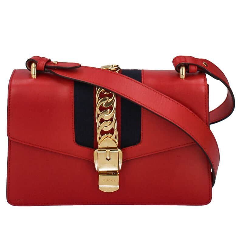 Elevate your style with the iconic Gucci Sylvie Small One Shoulder Bag. Crafted from luxurious red leather, this sophisticated women’s handbag exudes elegance and charm. The sleek design features the signature striped webbing and a gold chain shoulder strap for a touch of glamour.