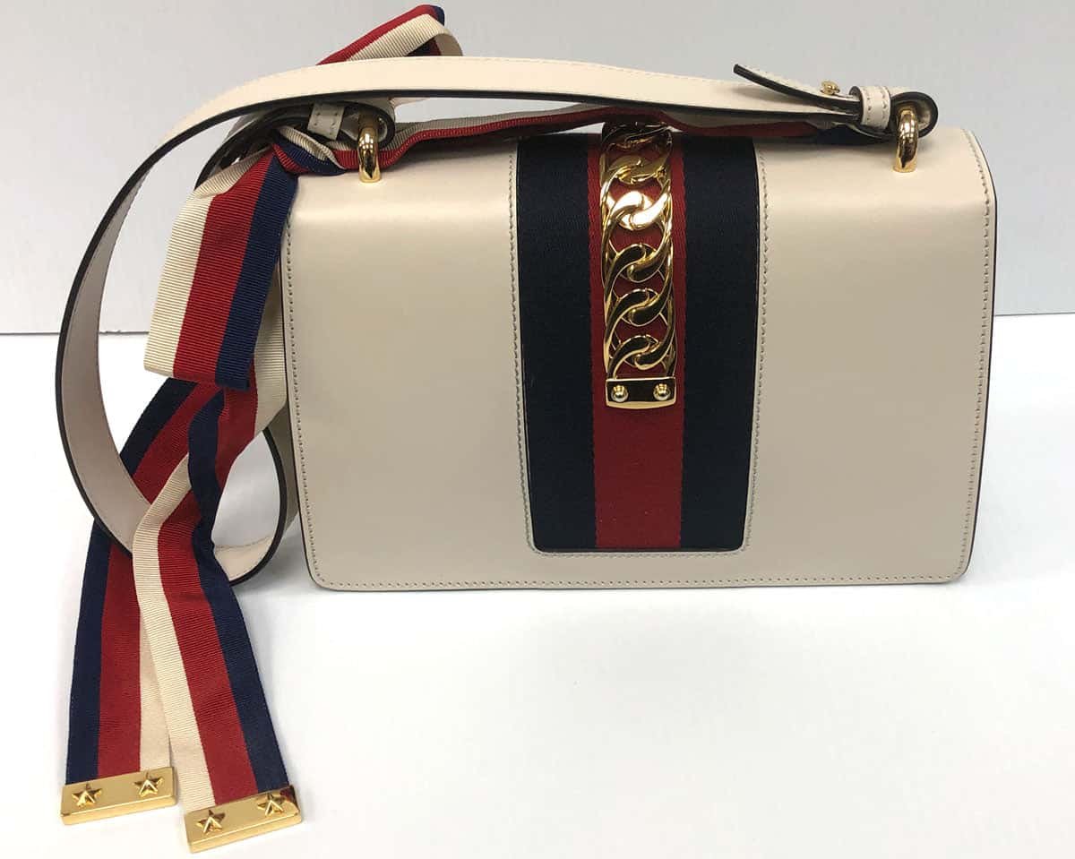 A playful mix of House codes, the Sylvie shoulder bag combines a gold metal chain and buckle with contrasting Web stripe details. The signature Gucci shape from the ’60s and ’70s is brought back from the archives in a modern iteration that can be mixed-and-matched with different straps and in a number of ways. The structured silhouette comes with two straps: one leather shoulder strap and one grosgrain ribbon that converts from top handle to shoulder.