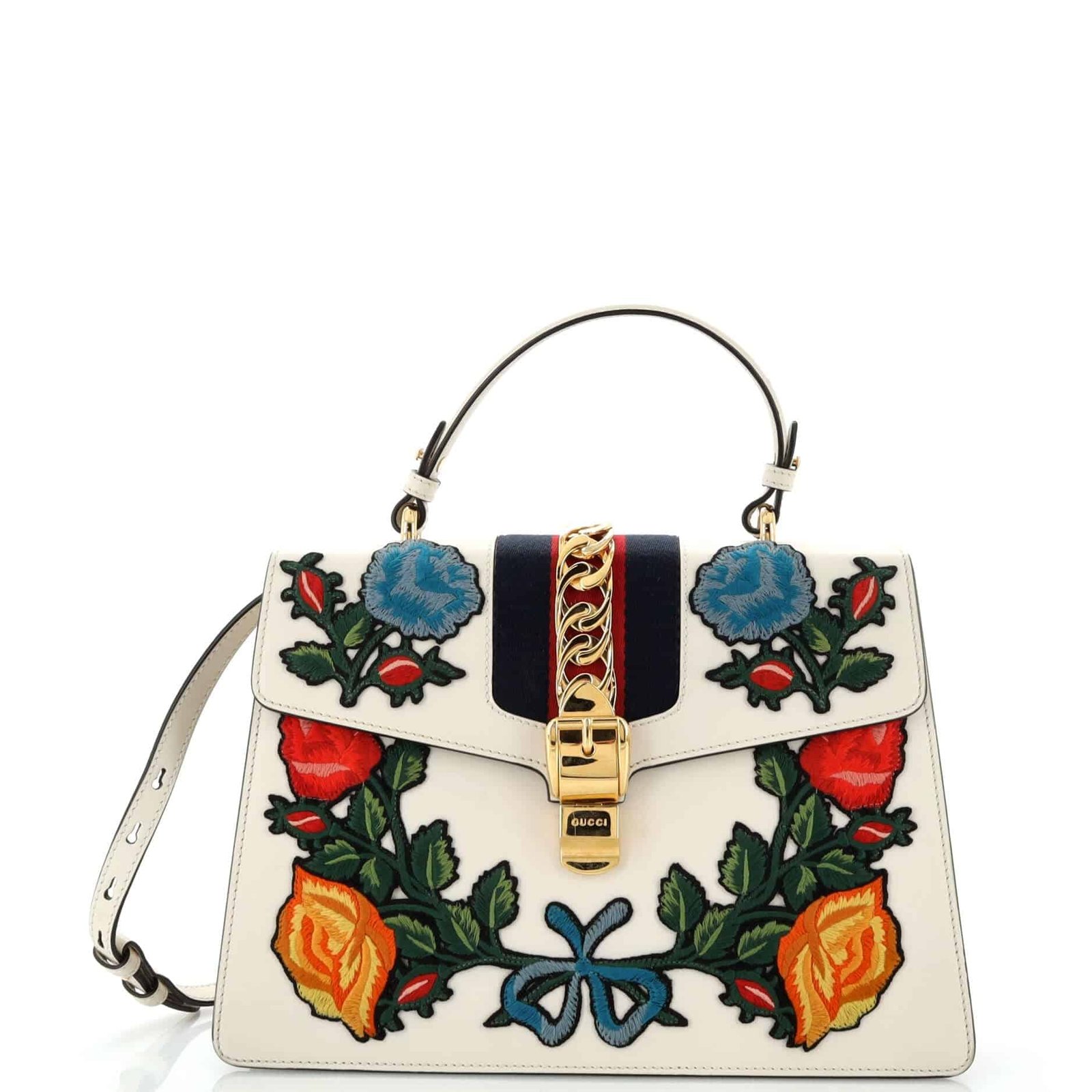 Elevate your style with the Gucci Sylvie Top Handle Bag. Crafted from luxurious leather, this medium-sized bag features intricate embroidery for a touch of sophistication. The iconic Sylvie Web stripe adds a classic yet modern flair to this timeless piece.