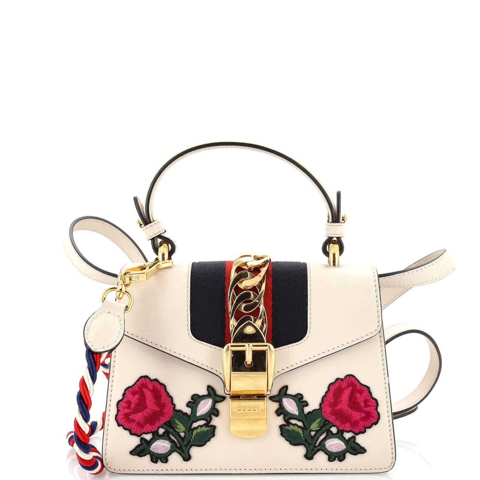 Elevate your style with the Gucci Sylvie Top Handle Bag. Crafted from luxurious leather, this mini bag features intricate embroidery for a touch of sophistication. The iconic Sylvie Web stripe detail adds a pop of color, while the top handle and detachable shoulder strap offer versatility in wear. Perfect for day or night, this statement piece is a must-have for any fashion-forward individual seeking a chic and timeless accessory.