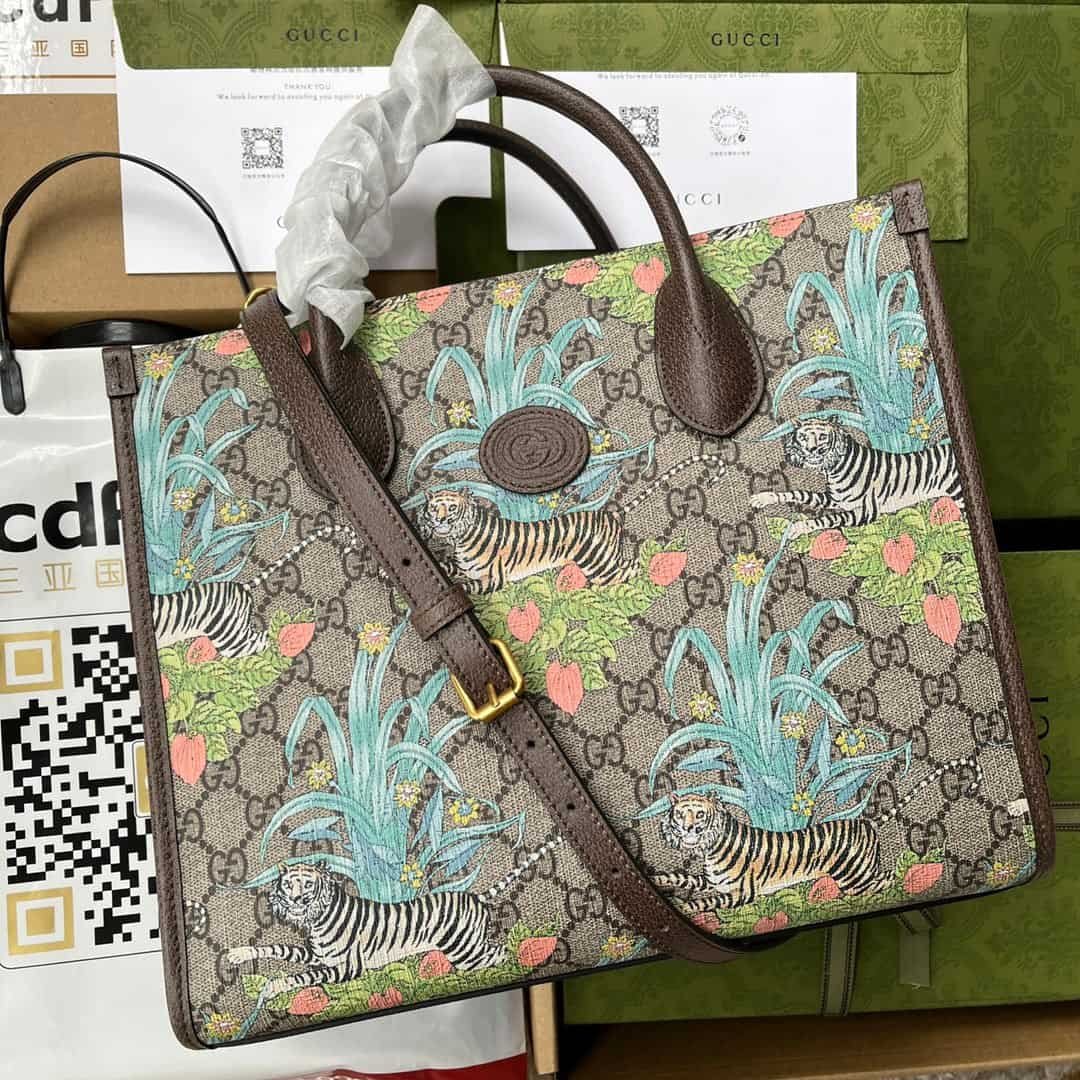 This medium GG tote bag is characterized by the printed motto ‘Gucci Tiger.’ References to the feline are often seen throughout the Creative Director’s collections as an expression of the House’s fascination with the wild beauty of the natural world.