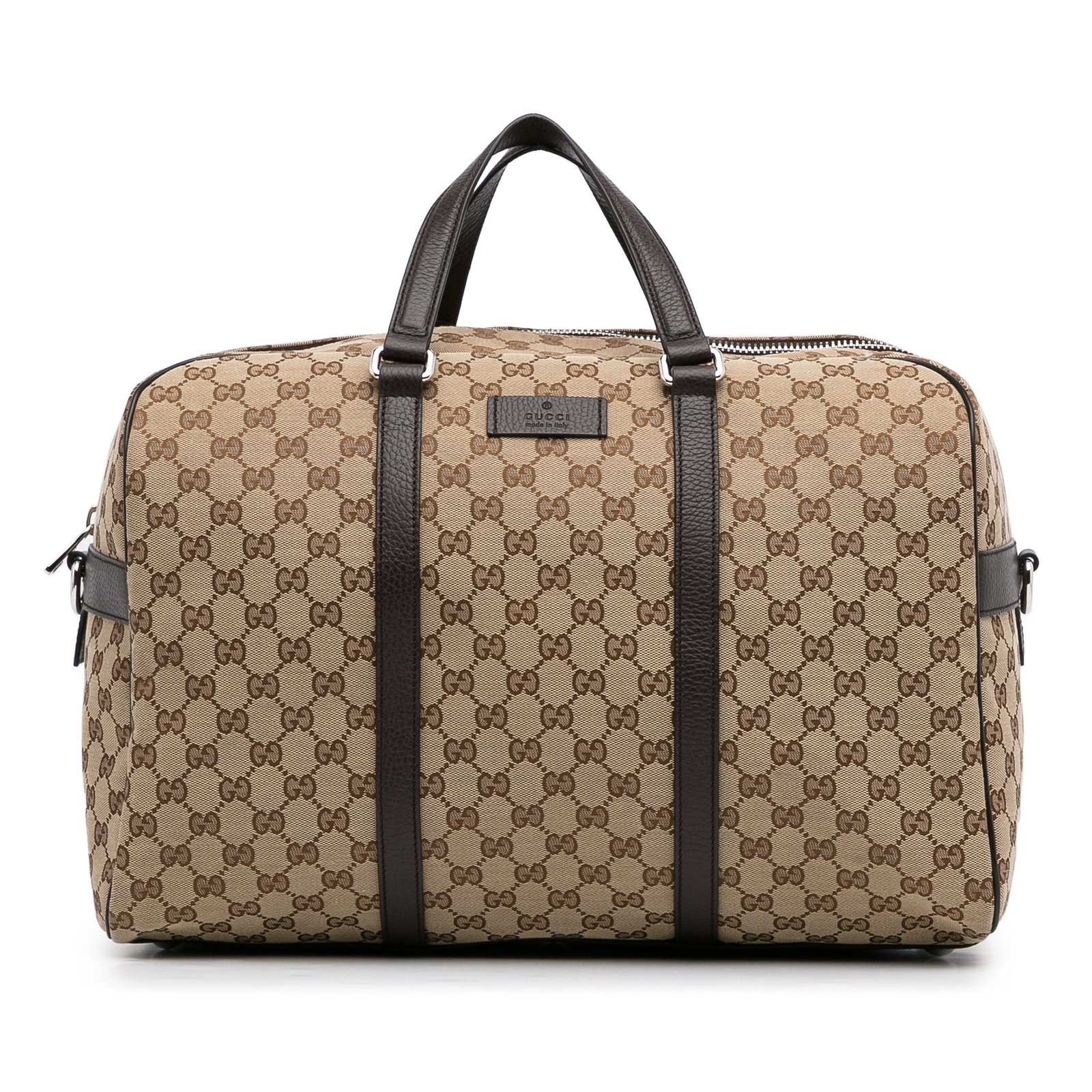 This travel bag from Gucci is made of the famous GG canvas with dark brown leather trim and flat leather handles with silver-tone details. It has a detachable shoulder strap so it can be carried either by hand or loosely over the shoulder. It closes with a zipper at the top and offers zippered and slip pockets inside.
