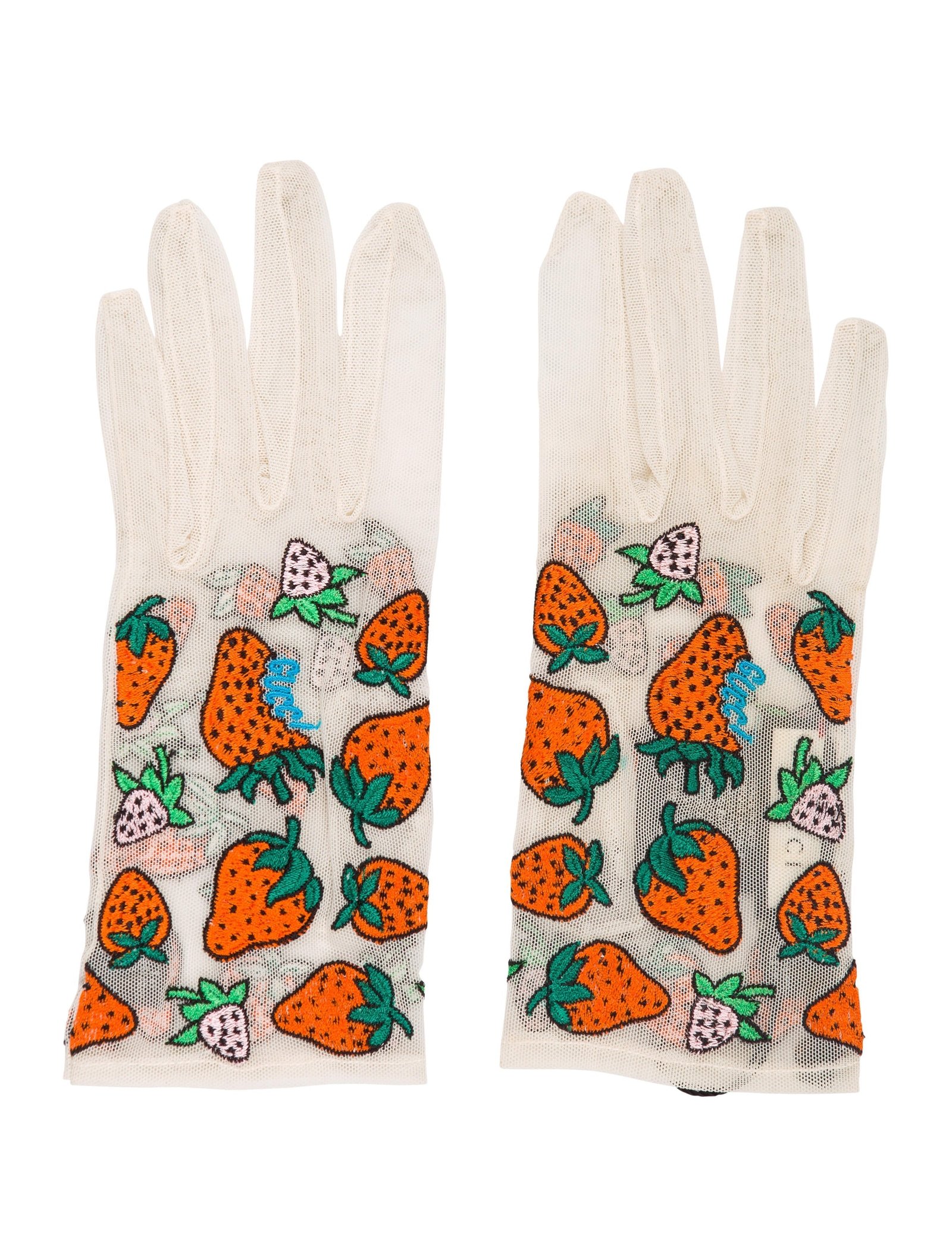 The Gucci Tulle Strawberry Embroidered Gloves in White is crafted in Italy from a polyamide blend into a mesh, tulle fabric. These lightweight gloves have a slight stretch and feature an embroidered strawberry print in bright red and green, and a stitched Gucci logo in blue.