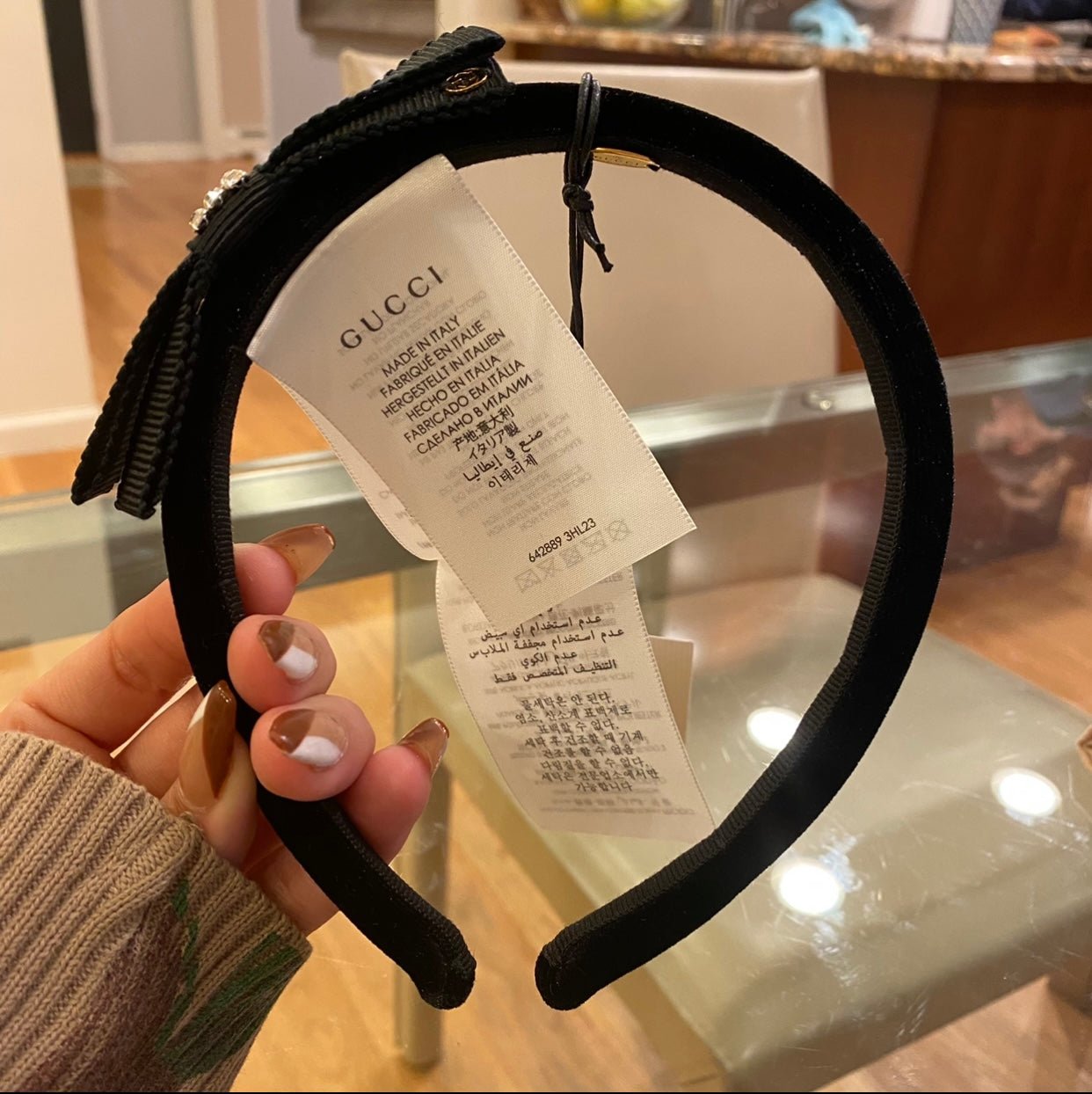 Accessories speak a language of self-expression throughout the latest collections. Crafted from rich black velvet, this headband is decorated with a bow and shining crystal details.