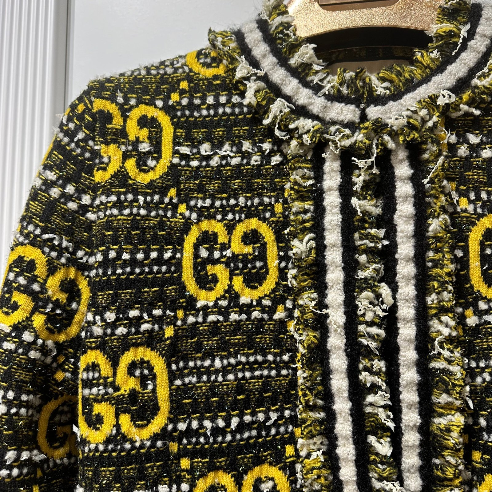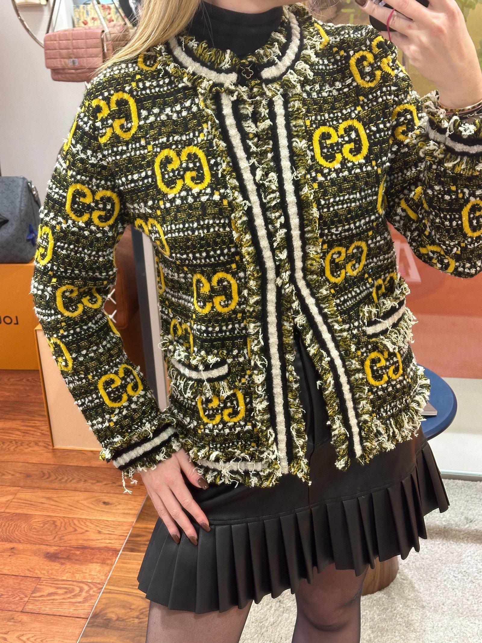 Magnifique veste en tweed noir, blanche et jaune à logo GG.