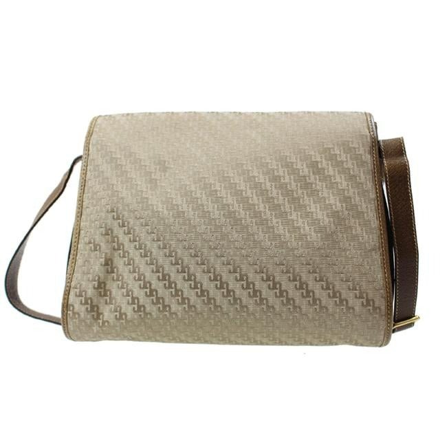 This purse is a rare design you don’t often see, especially in this condition! The bag has a squared G logo style print embossed in the fabric in a khaki color. It has brown leather framing the purse at the strap, sides, piping and top. It has an adjustable shoulder strap and is a classic, square shape with an envelope flap top.