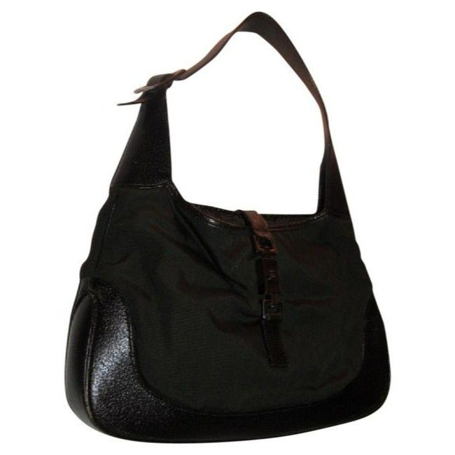 * For sale is a Gucci, brown leather and olive green canvas body, medium to large size, Jackie- O style, rounded bottom, shoulder bag with chrome push clasp and accents! It is a the classic mod style from Gucci in the medium to large size in an unusual color combination that would be great used as your signature, dark green/brown purse!