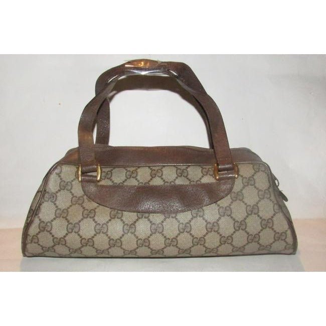 The bag is made of a brown, large ‘G’ logo design coated canvas and leather. This purse is from the Gucci Accessory Collection and is a a satchel style that is similar ‘Boston’ or ‘Speedy bag’, but is a really unique shape that I think is called a ‘bullet bag’. It has two handles and is meant to be handheld and is a larger size. There is a zip closure on top. It is done in contrasting browns with light gold tone hardware.