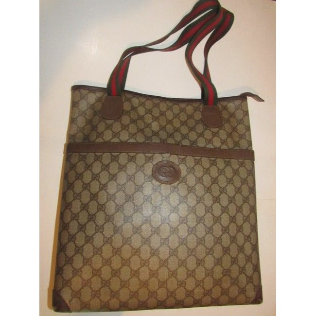 For sale is a vintage, Gucci ‘Supreme’ XL tote made with brown large G logo print coated canvas and brown leather with a zip top closure, front exterior pocket, red and green striped straps, and lots of room! It is a classic, gorgeous bag from Gucci, perfect for any time of year!