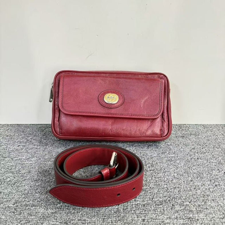 This Gucci vintage red crossbody bag is perfect for enthusiasts of stylish and functional used designer handbags. Crafted from luxurious leather, it features a detachable strap, a snap closure, and a spacious interior. A must-have for those who cherish vintage Gucci bags.