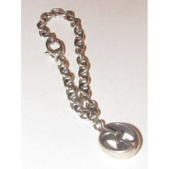 For sale is a vintage, Gucci, sterling silver, AMAZING, substantial, charm style bracelet with a large, 1′ in diameter, ‘GG’ logo charm! This bracelet has a vintage look that is just as stylish today! The bracelet is gorgeous and unique! It is a classic, chunky charm style bracelet. It is comprised of a heavy sterling silver, oval link, chain. At the center of the links is a large, 1′ in diameter, Gucci ‘GG’ logo charm i the 1973 logo design. 8’L x 0.5’W x 0.38’H. N0815