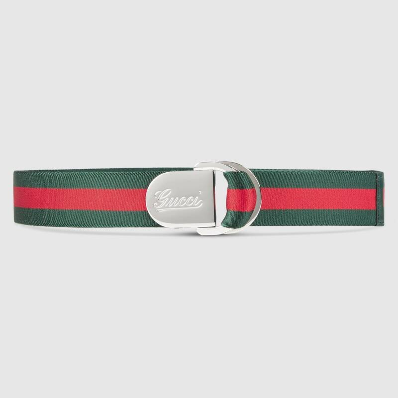 The Gucci Web Belt with Gucci Buckle in Green is crafted in Italy with a nylon strap and polished silver-tone hardware. This belt features a green and red webbed strap, leather trim, and a D-ring buckle with a script Gucci logo.