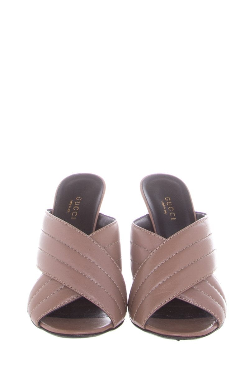 Gucci Webbey Taupe Criss Cross Mules. This item is in good condition with some wear to soles.