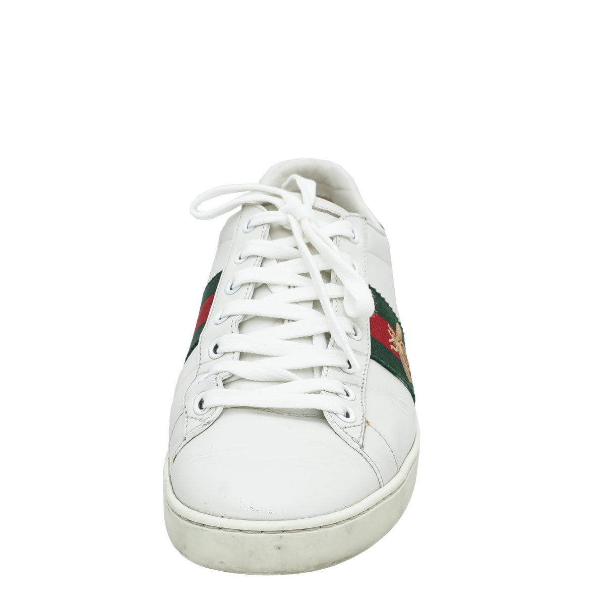 - Material: White Leather with Green/Red Web and Gold Embroidered Bee with Red Snakeskin Leather Detail on The Back of One Shoe and Green on The Other.