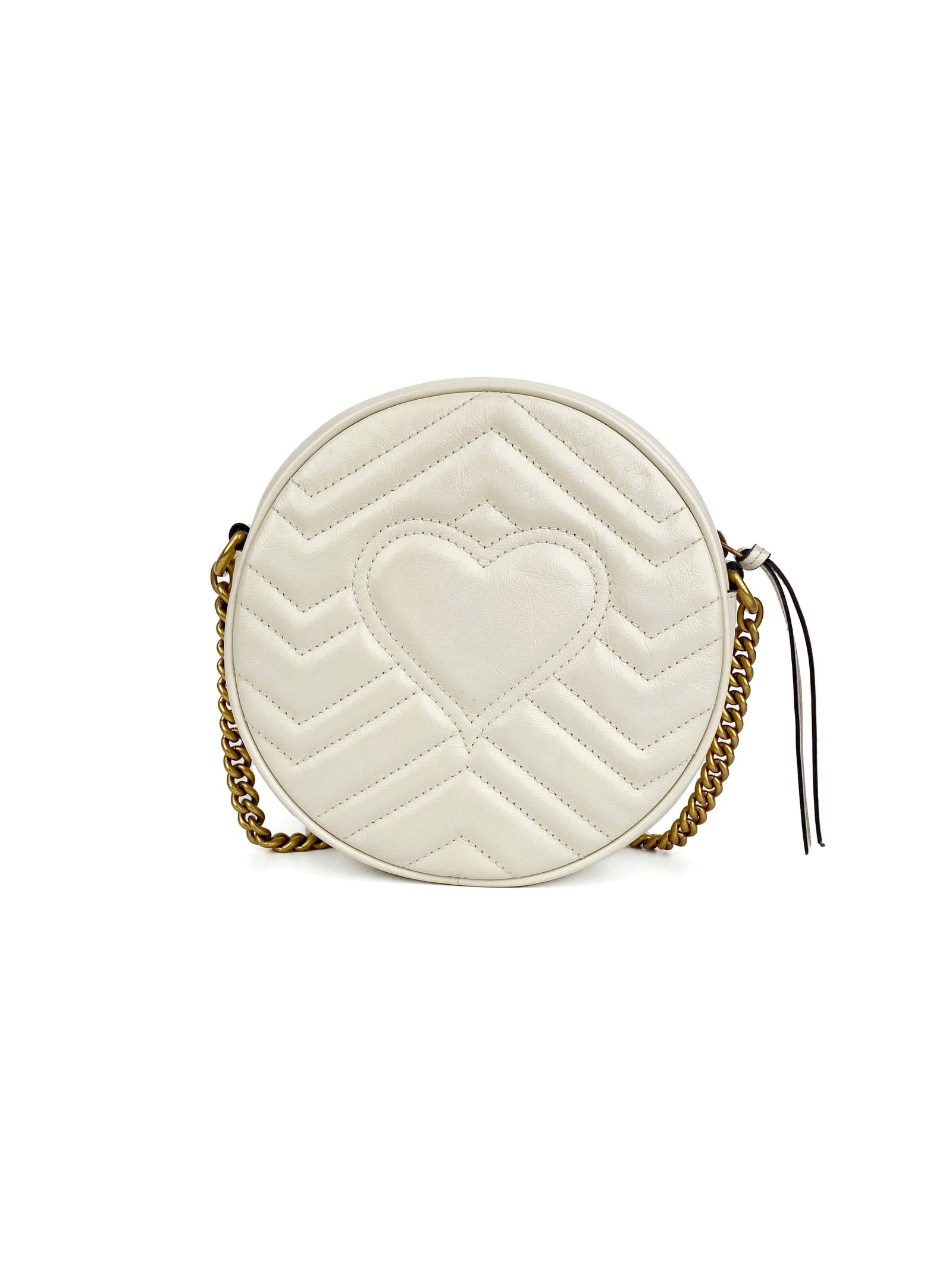 Description : This beautiful Marmont from the Cruise 2019 line features distinctive ‘GG’ hardware and matelasse chevron leather with heart stitched on the back. No longer available on the Gucci website. In excellent condition; very mild signs of wear.