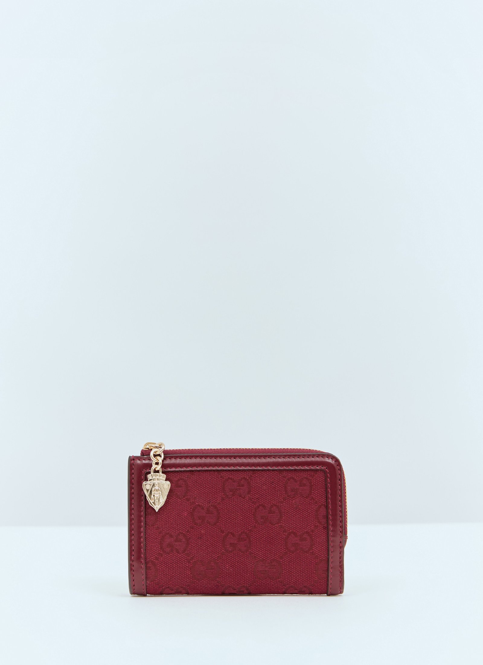 GG mini wallet in canvas with Crest zip puller. Bi-fold construction Eight card slots Bill compartment Zip-fastening coin-pocket Logo jacquard Made in Italy 71% Cotton, 29% Polyester Color: Red Code: 790036 FADHY 6207