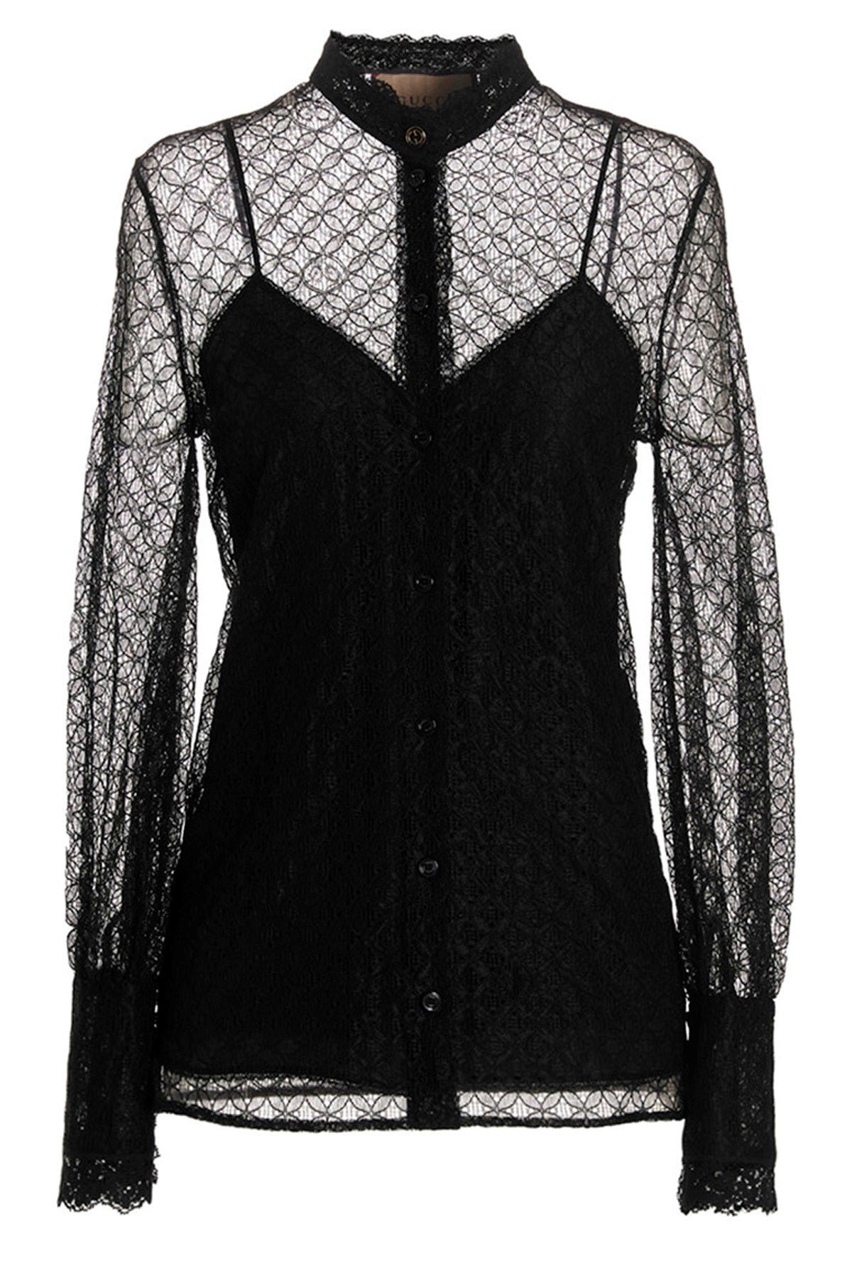 GG’ geometric lace shirt with removable tank top, high neck, long puff sleeves and a button closure. Color: Black Composition: 84% polyamide 16% cotton Size&Fit: True to size fit