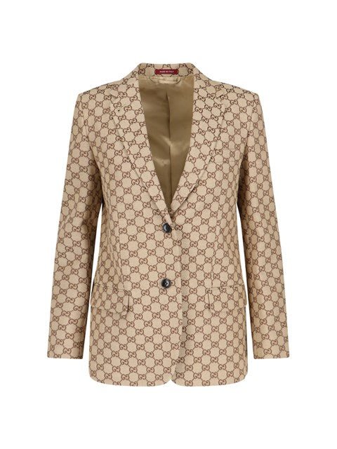 Gucci ‘GG’ single-breasted jacket in beige Original GG fabric with peak lapels, button closure, button cuffs, chest pocket, two front flap pockets, central front vent, inner slip pocket, straight hem.