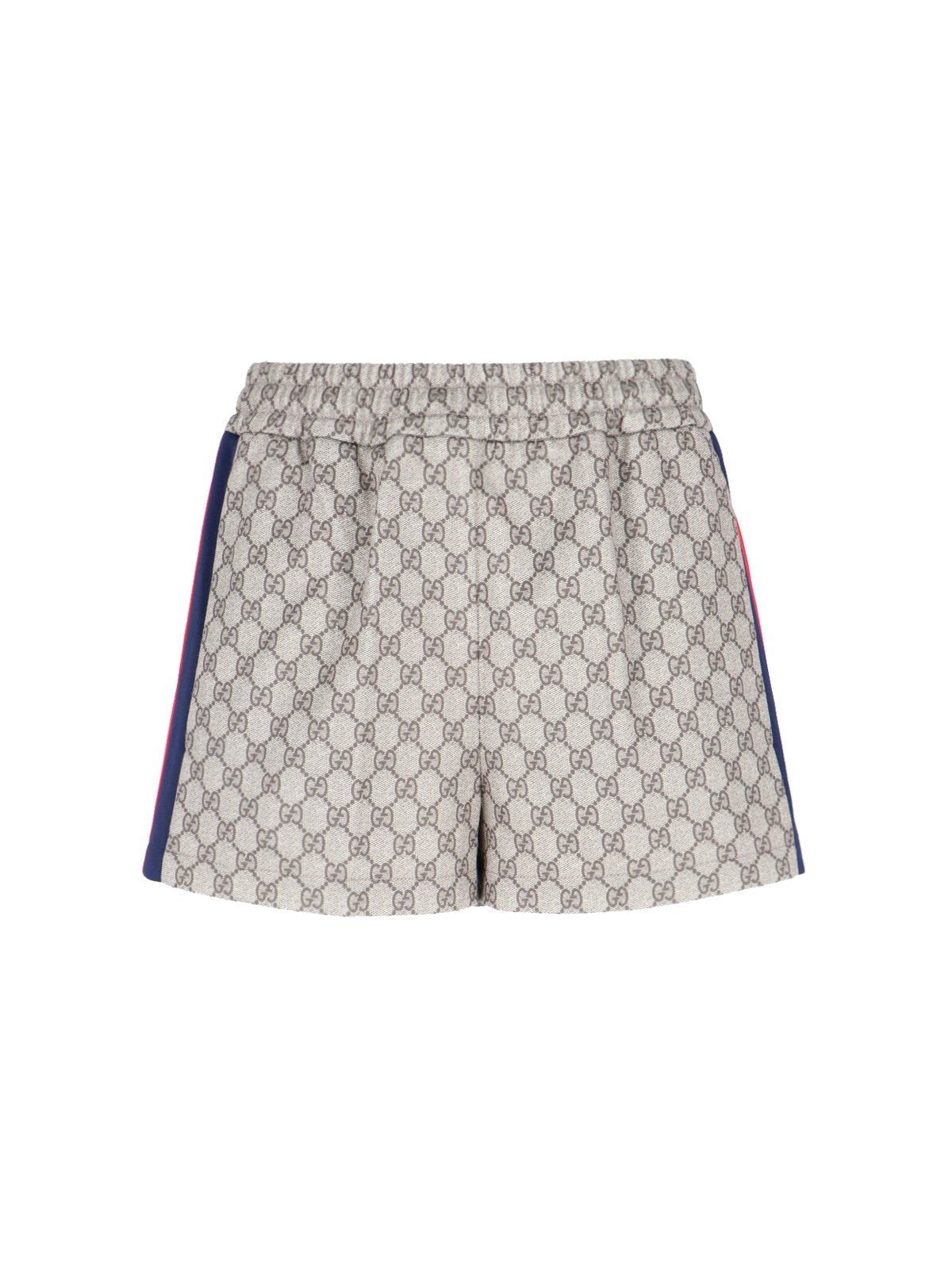 GUCCI ‘GG’ SPORTS SHORTS IN BEIGE TECHNICAL JERSEY WITH ICONIC ALL-OVER LOGO PATTERN, ELASTICATED MID-RISE, BLUE AND RED WEB TAPE DETAIL ON THE SIDE, TWO SIDE POCKETS, TWO BACK WELT POCKETS, STRAIGHT LEG.