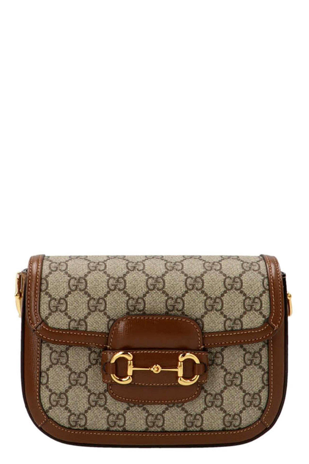 Gucci Horsebit 1955′ shoulder bag Iconic model of the maison, with GG Supreme print fabric, central web and gold horsebit detail, leather piping and removable web shoulder strap. Color: Beige Size & Fit: W 20.5 x H 14.5 x D 5.5 cm Composition: 60% polyurethane 20% cotton 20% polyester Made in: Italy