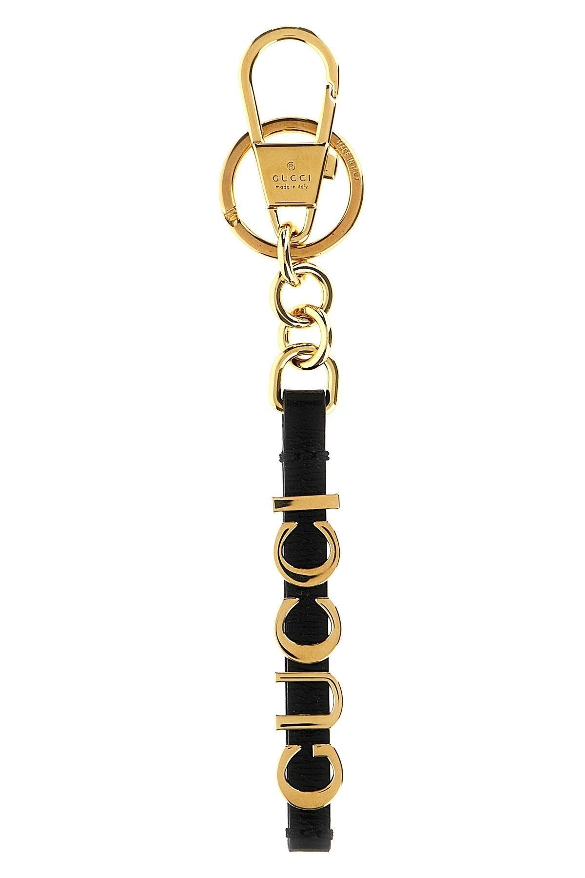 Gold leather and metal keyring with ‘Gucci’ logo, snap hook. Color: Black Size & Fit: 1 x 15 cm Composition: 100% brass Made in: Italy