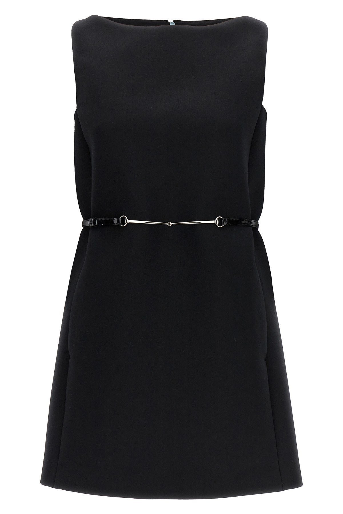 Sleeveless mini dress in stretch wool blend with boat collar, belt clamp detail. Color: Black Size & Fit: true to size fit Composition: 53% polyester 43% wool 4% elastane Made in: Italy