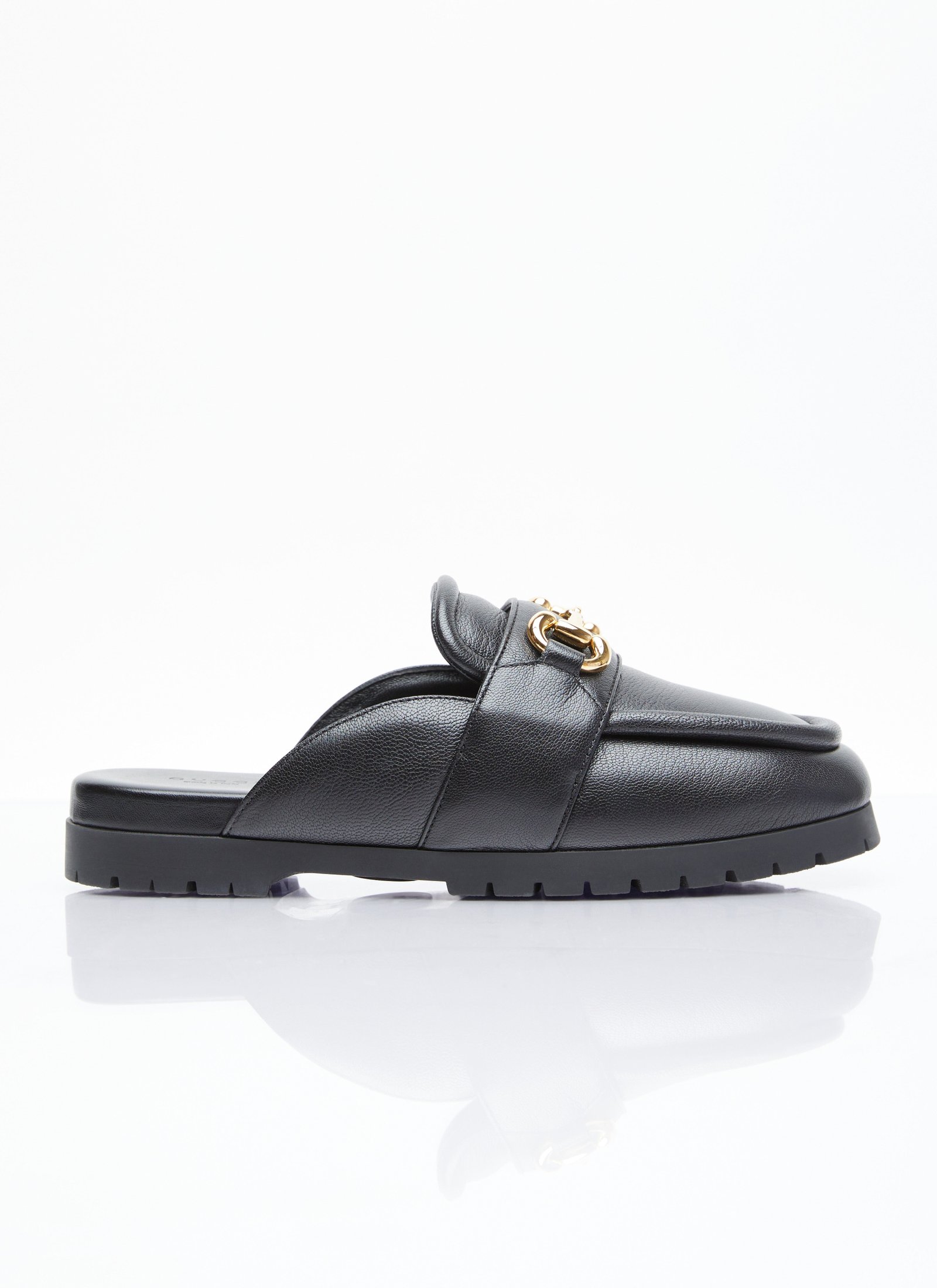 Horsebit loafer slippers in leather. Round toe Top horsebit hardware Debossed logo at footbed Rubber lug sole Made in Italy 100% Leather Color: Black Code: 771096 AACAI 1000