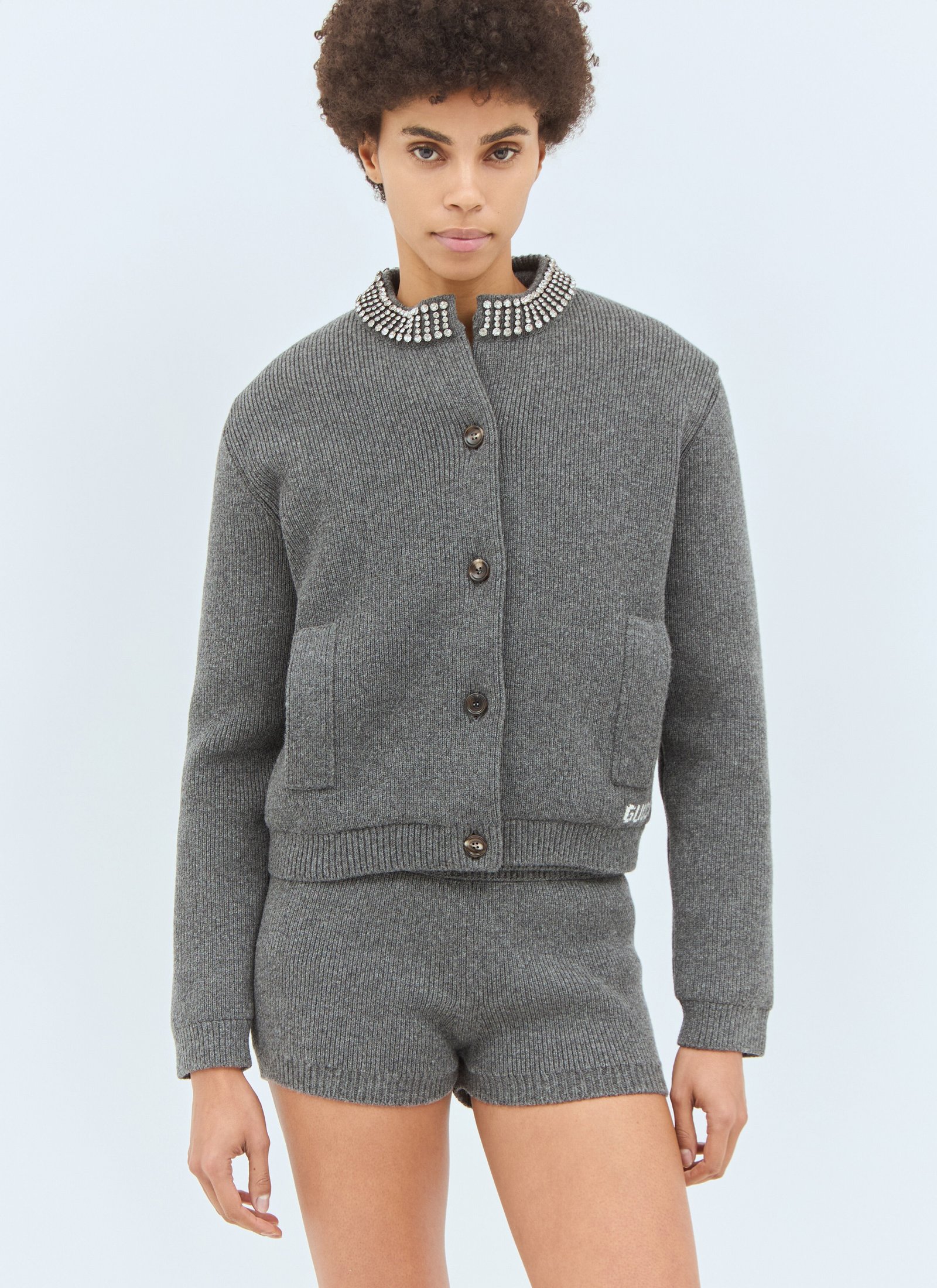 Padded cardigan in knit rib wool with crystal embellished neckline. Crewneck Front button fastening Long sleeves Side slip pockets Logo embroidery at hem Rib trims Padded Made in Italy 100% Wool. Lining: 75% Acetate. Padding: 100% Polyester. Dry clean Color: Grey Code: 807741 XKEFH 1189
