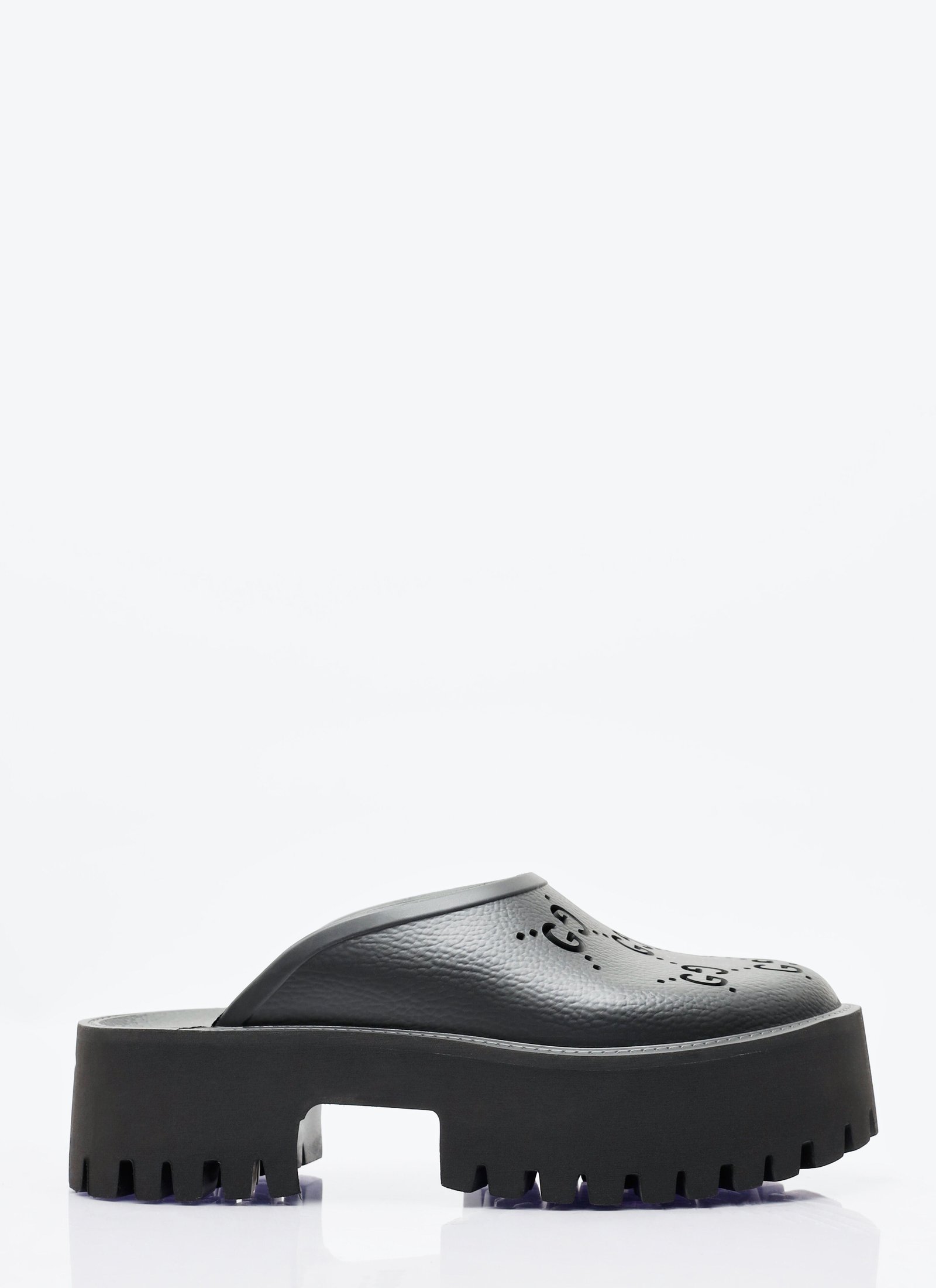 Perforated G platform mules. Perforated G motif Round toe Platform midsole Made in Italy 100% Rubber. Color: Black Code: 663577 JFB00 1000