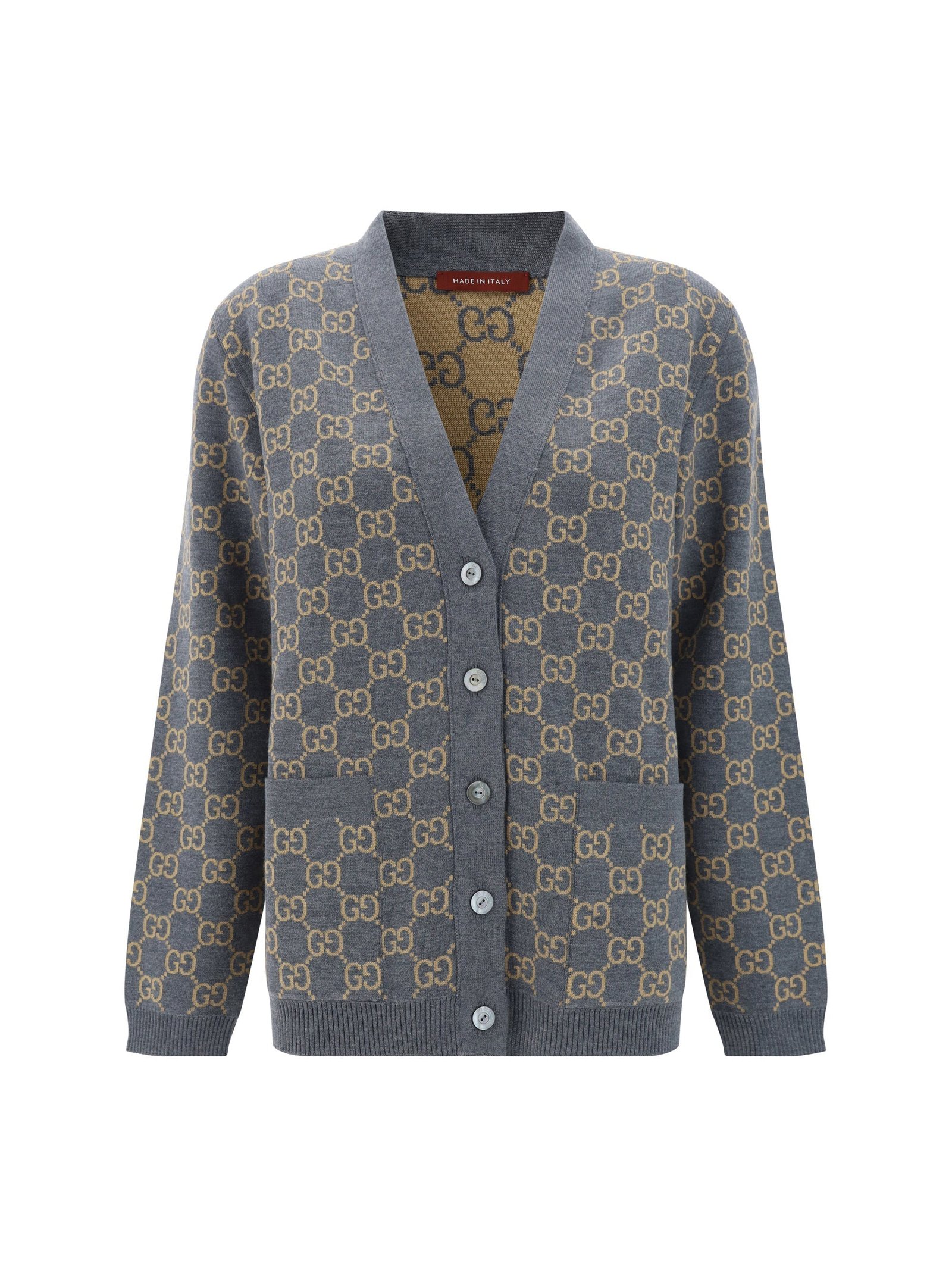 Reversible Wool Cardigan by Gucci, V-neck, front button closure, two front welt pockets with flaps, ribbed hem, ribbed cuffs, iconic all-over printed brand pattern, regular fit.