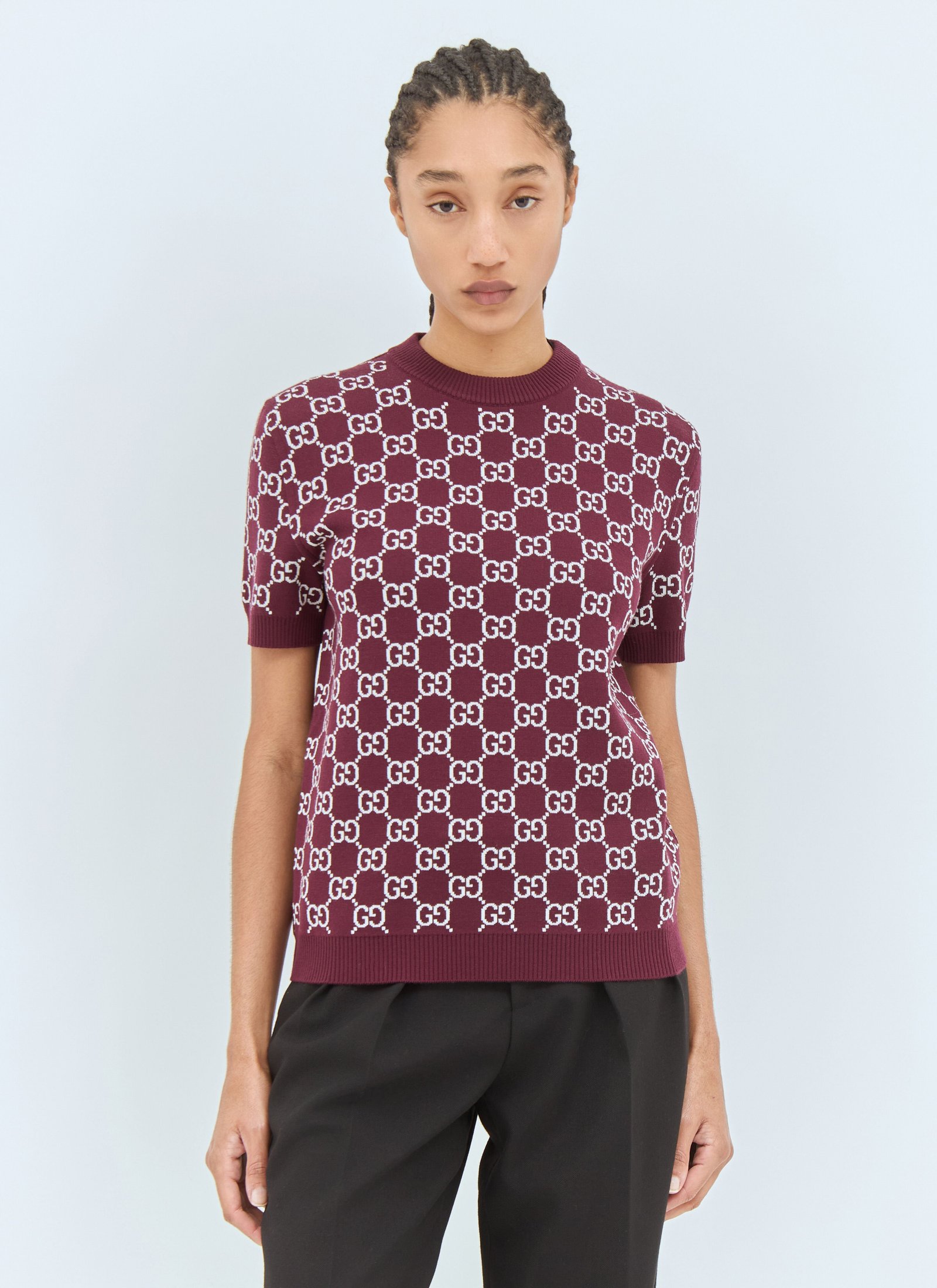 Reversible GG jacquard top in wool knit. Crewneck Short sleeves Logo jacquard Ribbed trims Made in Italy 96% Wool, 3% Polyamide, 1% Elastane, Dry clean Color: Burgundy Code: 798159 XKD8T 6419