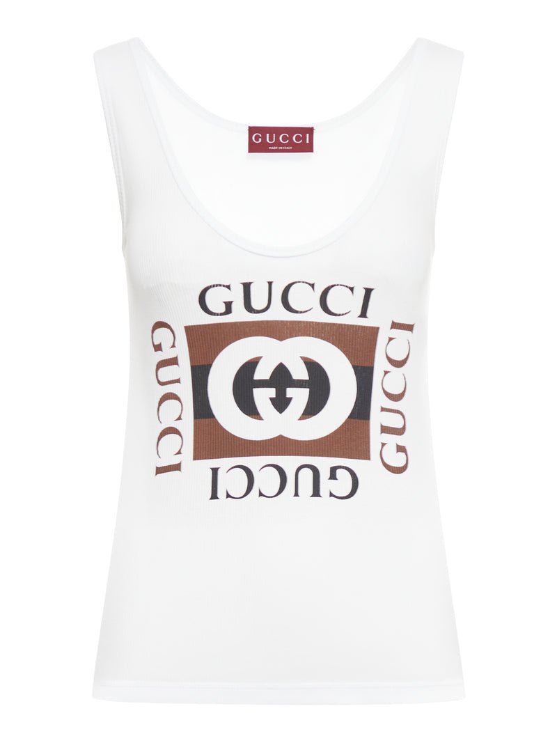-White ribbed cotton -Gucci Crossroads GG print -U neckline -Sleeveless model Made in Italy Composition: Cotton 100% Cotton Color code: 9875 WHITE BROWN