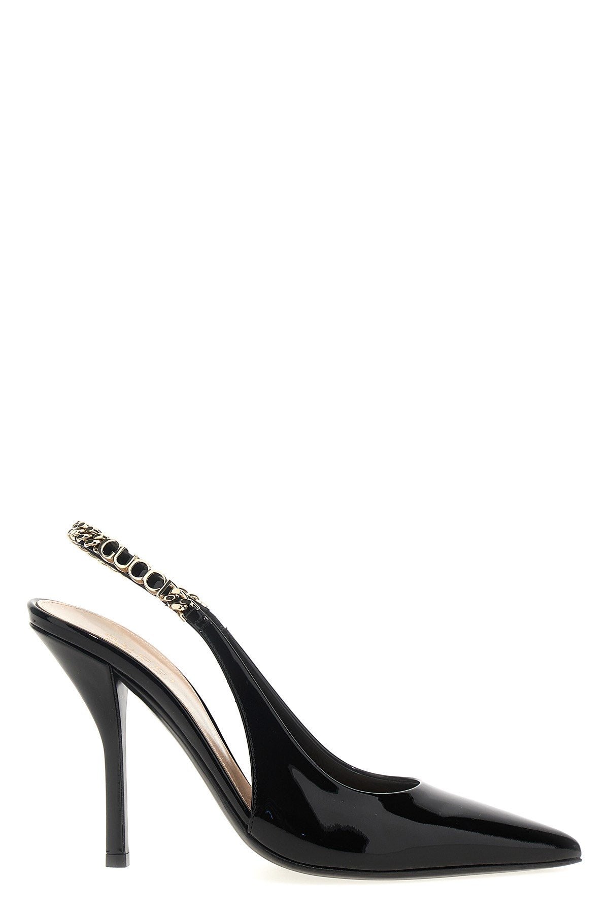 Signoria’ patent leather slingbacks with strap with metal logo detail, stiletto heels. Color: Black Size & Fit: EU WOMEN Heel: 10.5 cm Composition: 100% calfskin leather (Bos Taurus) Made in: Italy