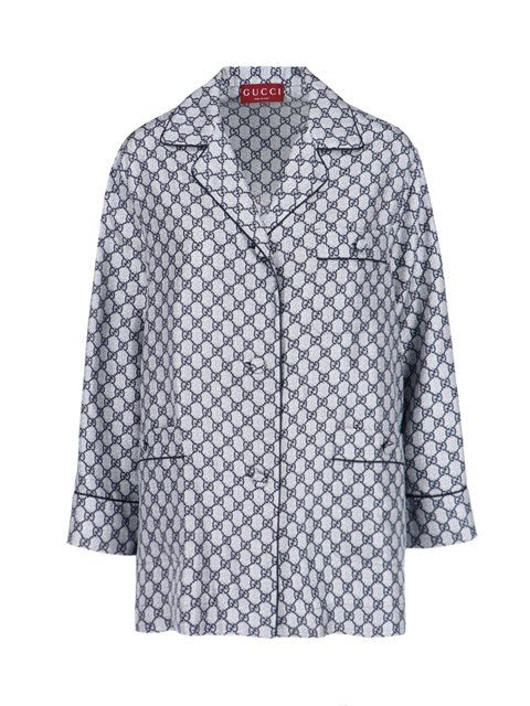 Gucci blue twill silk jacket with all-over ‘GG’ logo print, single-breasted closure with peak lapels, button closure, chest pocket, two front flap pockets, straight hem.