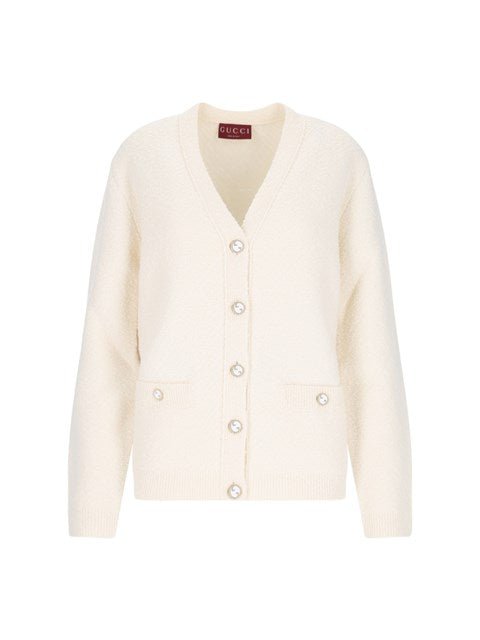 Gucci neckline cardigan in ivory cream wool bouclé with deep V-neck on the front, button closure, GG crossed logo detail, two flat pockets with front buttons, ribbed trim, straight hem.