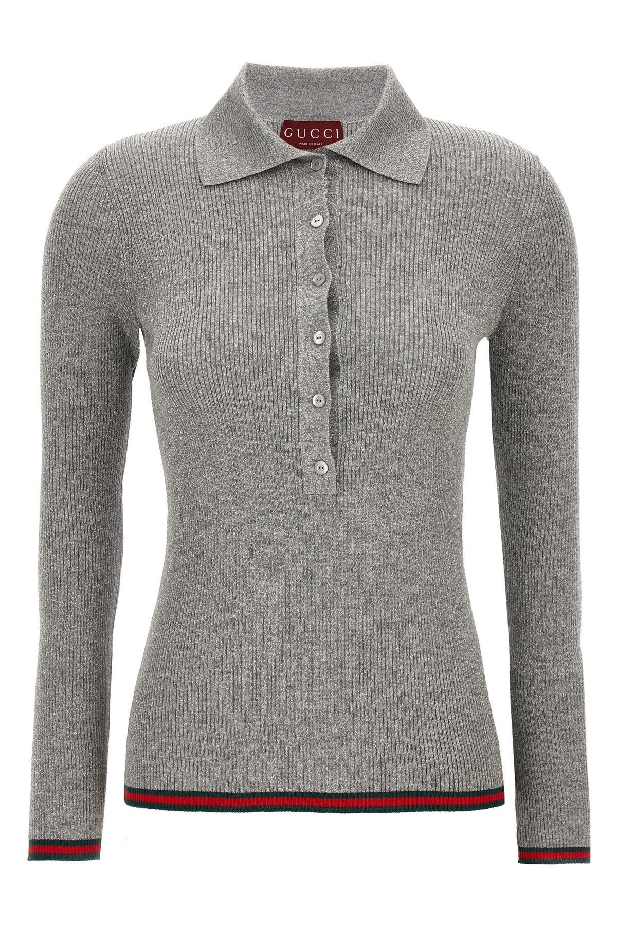 Lurex cashmere blend polo shirt with web ribbon detail on the bottom and long sleeves. Color: Silver Size & Fit: true to size fit Composition: 54% ws 21% silk 17% vi Made in: Italy