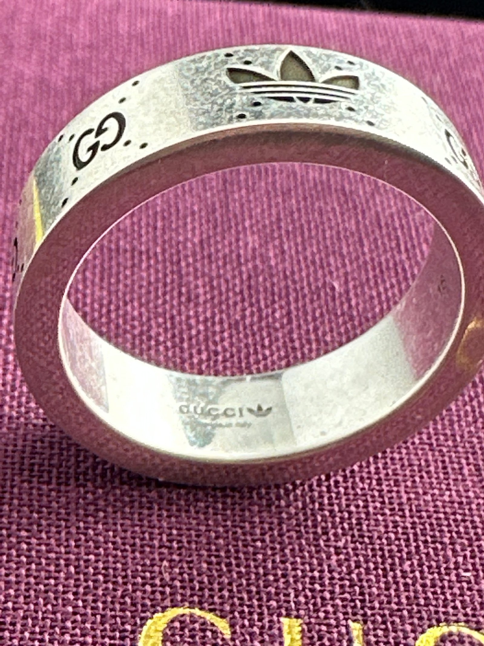 This branded Gucci x Adidas Sterling Silver Ring shows off the iconic interlocking G and trefoil logo in sophisticated style. Crafted from durable and classic silver, it’s sure to make a statement for years to come.
