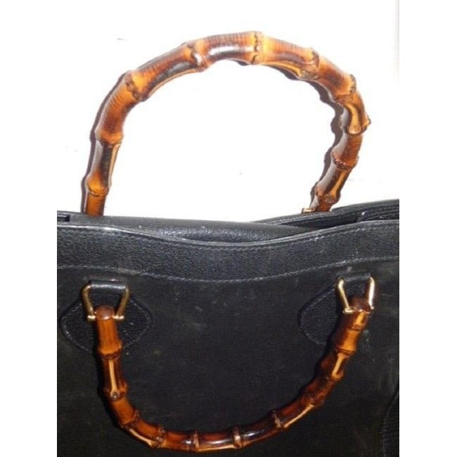 For sale is a vintage, mod look, Gucci, black suede and textured leather, classic style tote or shopper with two bamboo handles, a footed bottom, and gold accents! It has the 1960’s classic mod style Gucci is known for and would be great used as your signature black purse!