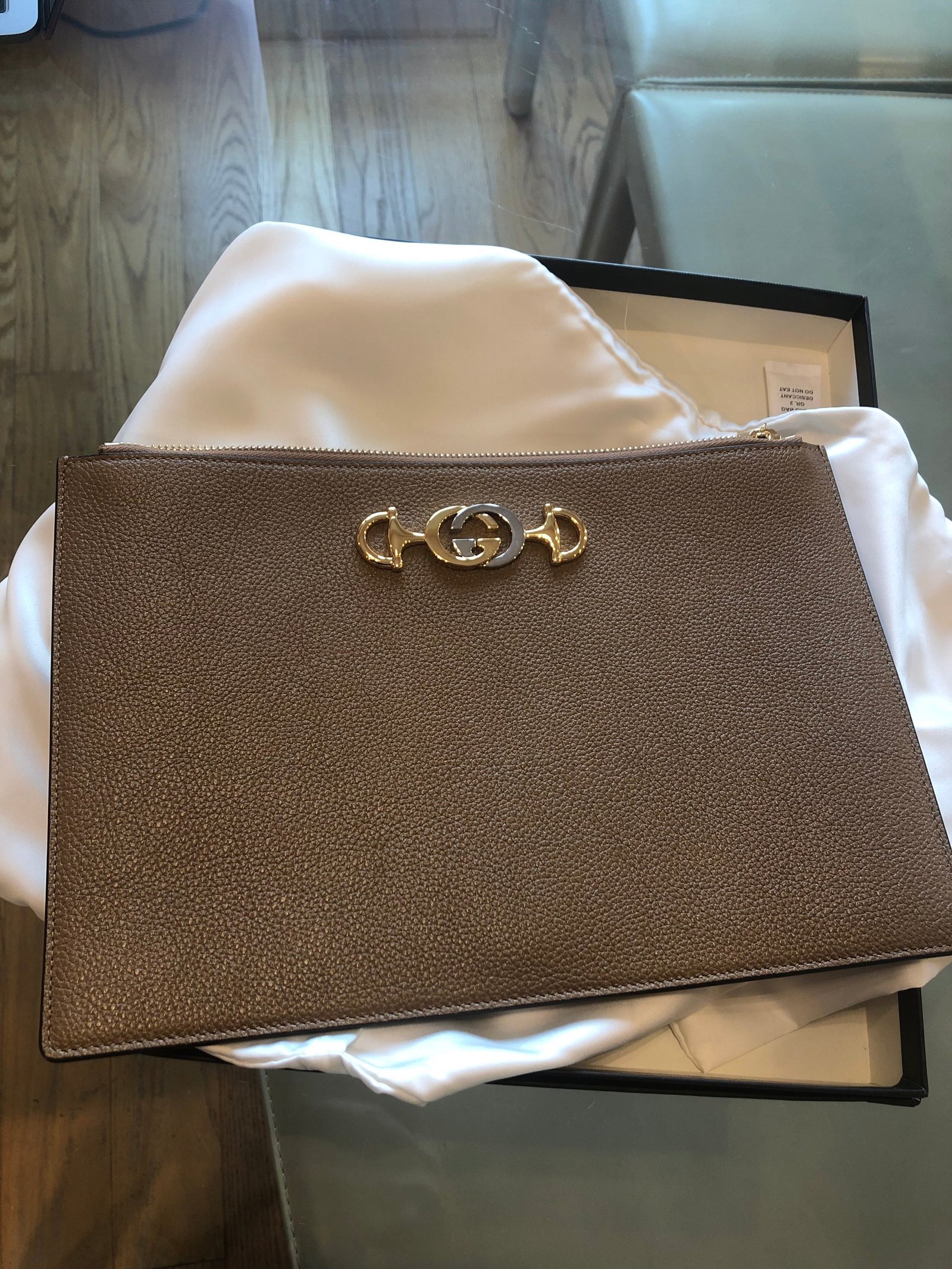 - The Gucci Zumi Horse Bit Clutch in Beige