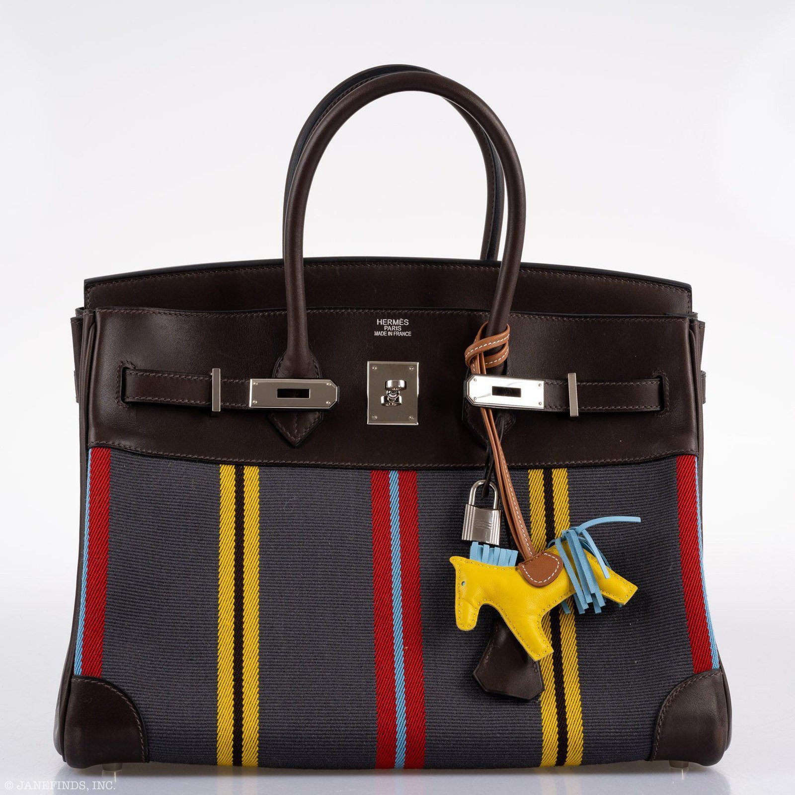 The initial decade of the 21st century was characterized by Hermès’ creation of Birkin bags in various printed canvases. These unique editions were released in incredibly scarce quantities, including the ones featuring the lively striped ‘Jumping Canvas.’ Among these unique pieces is the Birkin 35, meticulously accented with rich Chocolate box leather and complemented by Palladium hardware. The bag showcases bold, vivid stripes along its front and back, conferring a sporty aesthetic, perfectly embodying Hermès’ ethos of a vivacious, active lifestyle. Preserved in exceptional condition, this distinctive and sought-after piece is seldom seen in the resale market, testament to its rarity and collectability.