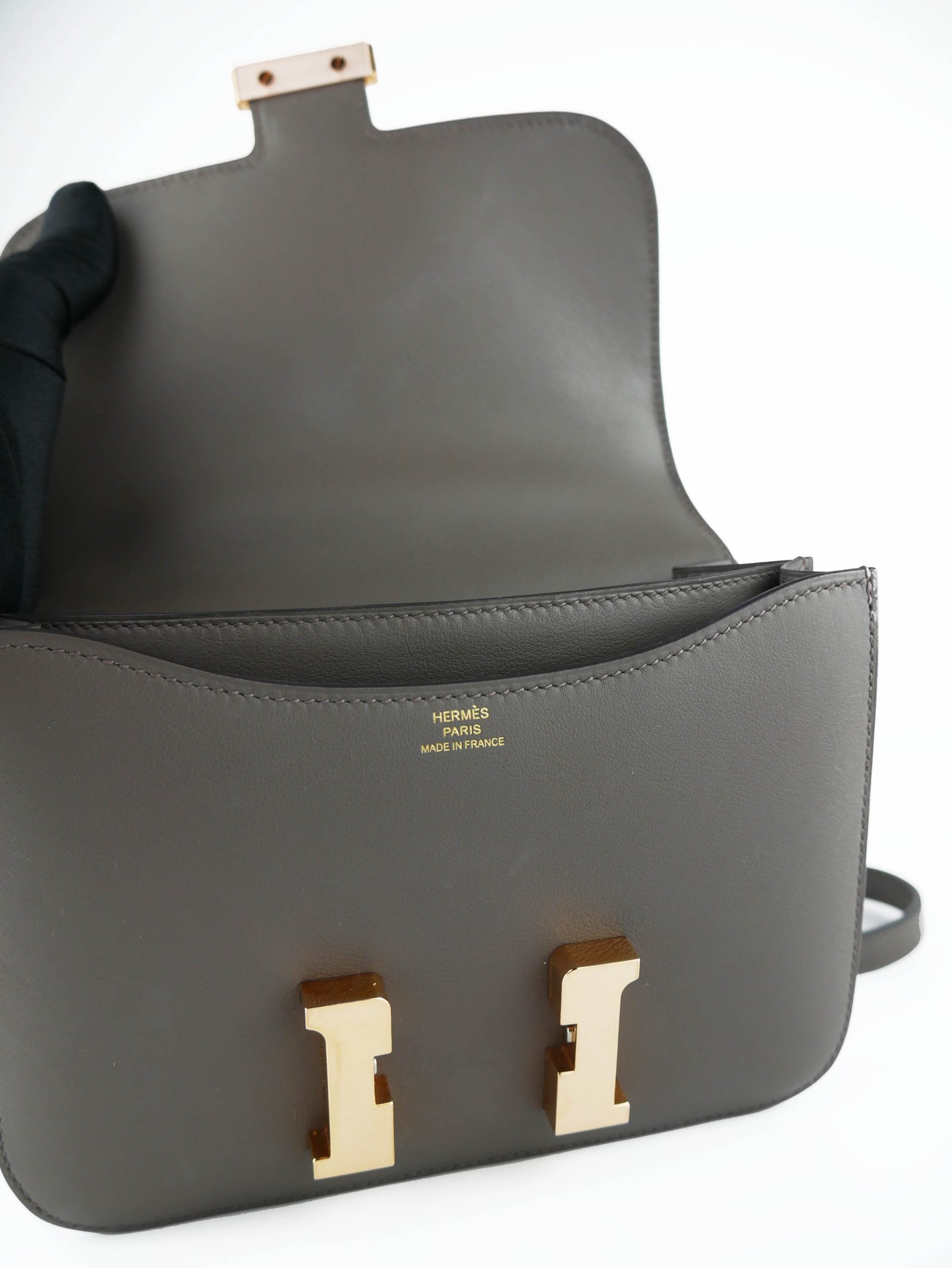 Description : Gorgeous soft grey Hermes bag with signature ‘H’ clasp. In great condition; scratches on clasp.