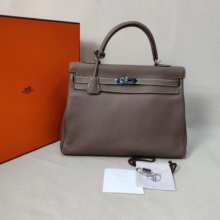 This chic HERMES Togo Kelly Retourne 32 in Etoupe is a stylish and timeless handbag crafted from luxurious Togo calfskin leather. Featuring a rolled leather top handle, an optional leather shoulder strap, and elegant palladium hardware, this bag is the epitome of sophistication. The goatskin leather interior offers ample space with zipper and patch pockets, making it both practical and beautiful. |