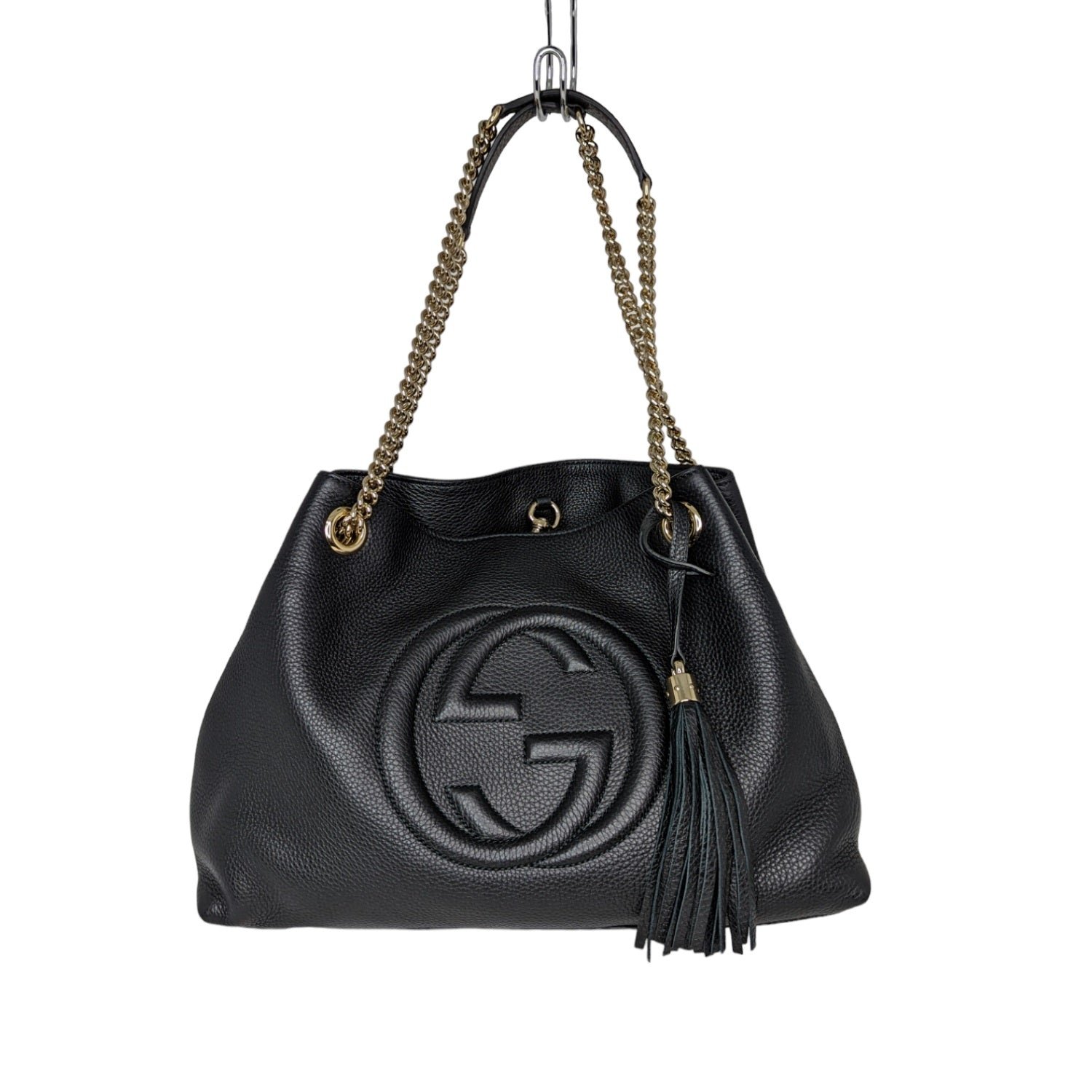 This shoulder bag is crafted of textured calfskin leather in black. The bag features a prominent front interlocking GG quilted logo, polished light gold chain link shoulder straps with shoulder pads, and a decorative light gold knobbed tassel. The top is open to a beige linen fabric interior with pockets.