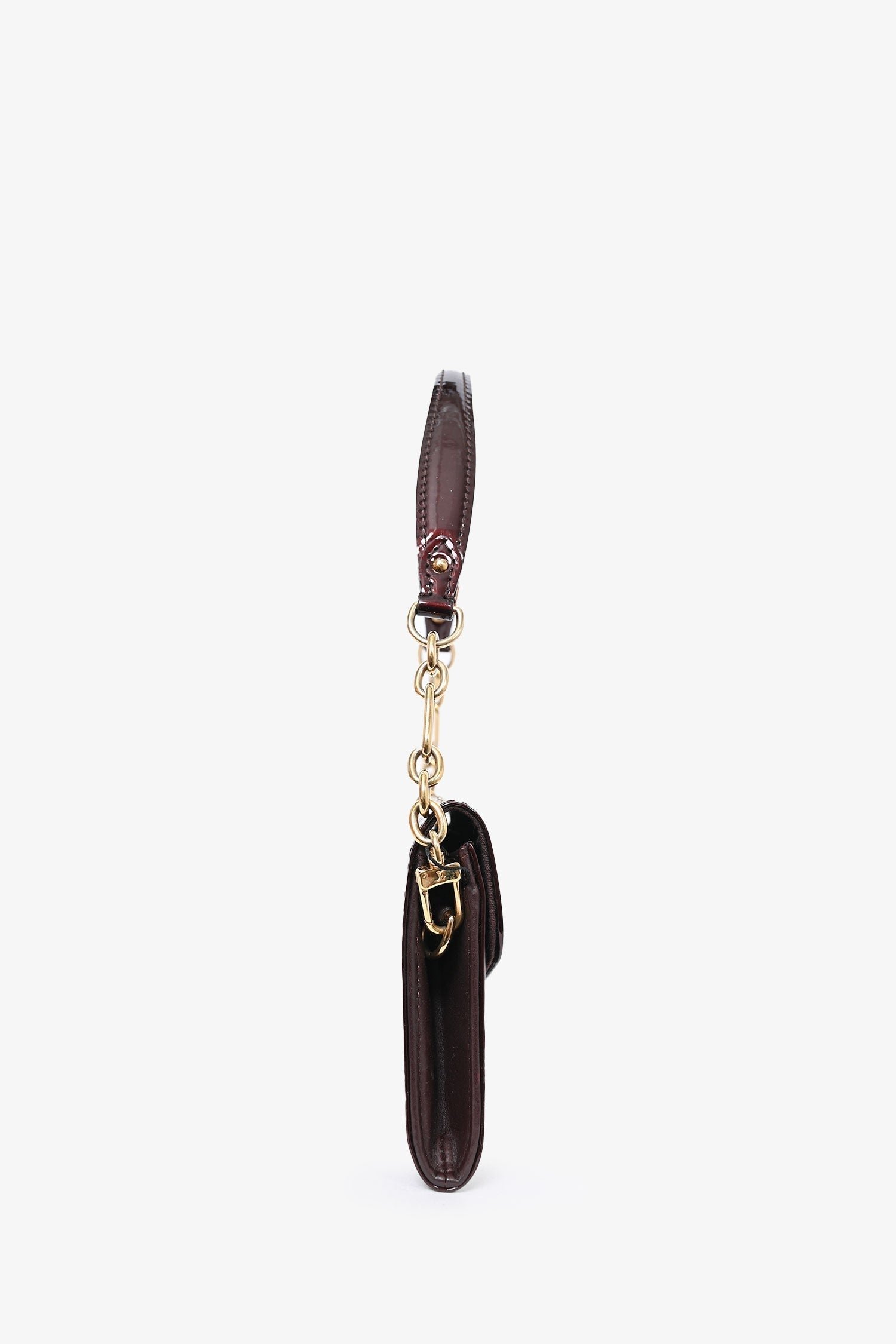Louis Vuitton 2010 Amarante Vernis Sunset Boulevard Wallet on Chain. Tonal stitching and gold-tone hardware. Fold-over flap with a snap closure. Chain-link and leather shoulder strap. Canvas-lined interior. 6 card holder compartments. 1 zipped interior.