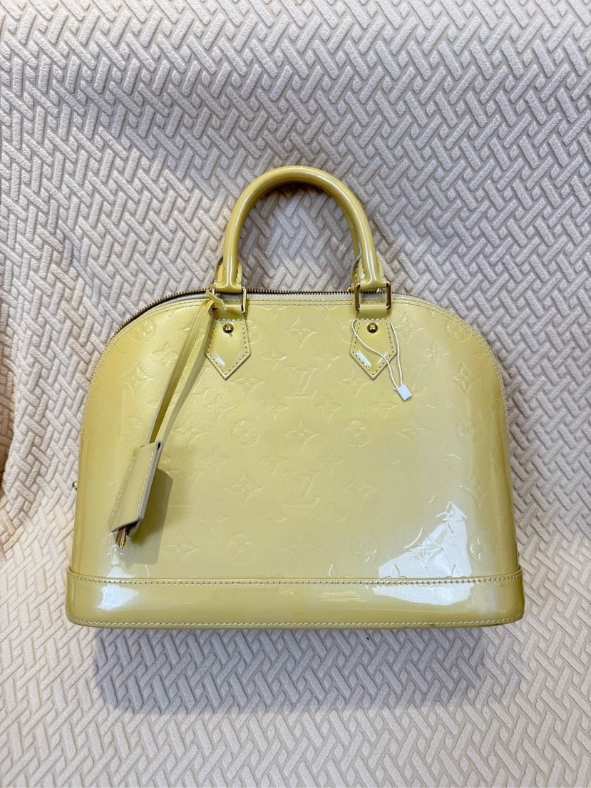 This authentic used Louis Vuitton Alma PM Bag in vibrant yellow patent leather exudes timeless elegance for vintage Louis Vuitton bags lovers. Its structured design features the iconic LV monogram, gold-tone hardware, double handles, and a spacious, beige-lined interior perfect for essentials. Whether you’re a collector or favor used designer handbags, this classy piece is a chic pick.