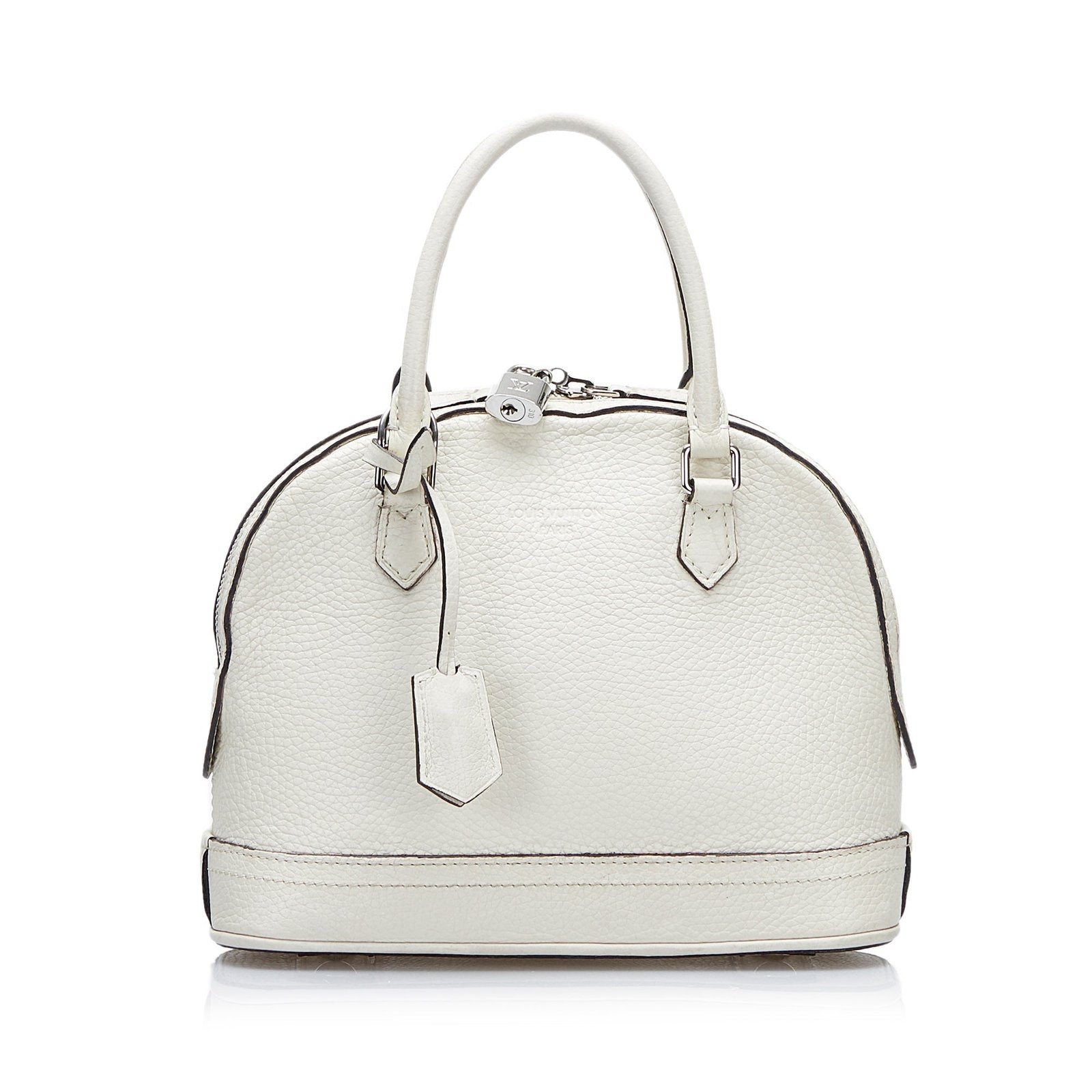 Diese Louis Vuitton Alma in der Grösse PM wurde aus beigefarbenem Taurillon Leder gefertigt. Die Tasche besitzt goldene Details, gerollte Henkel aus Leder, einen Reissverschluss an der oberen Öffnung und ein Innenfach. Die Tasche wird in der Hand oder im Arm geführt.