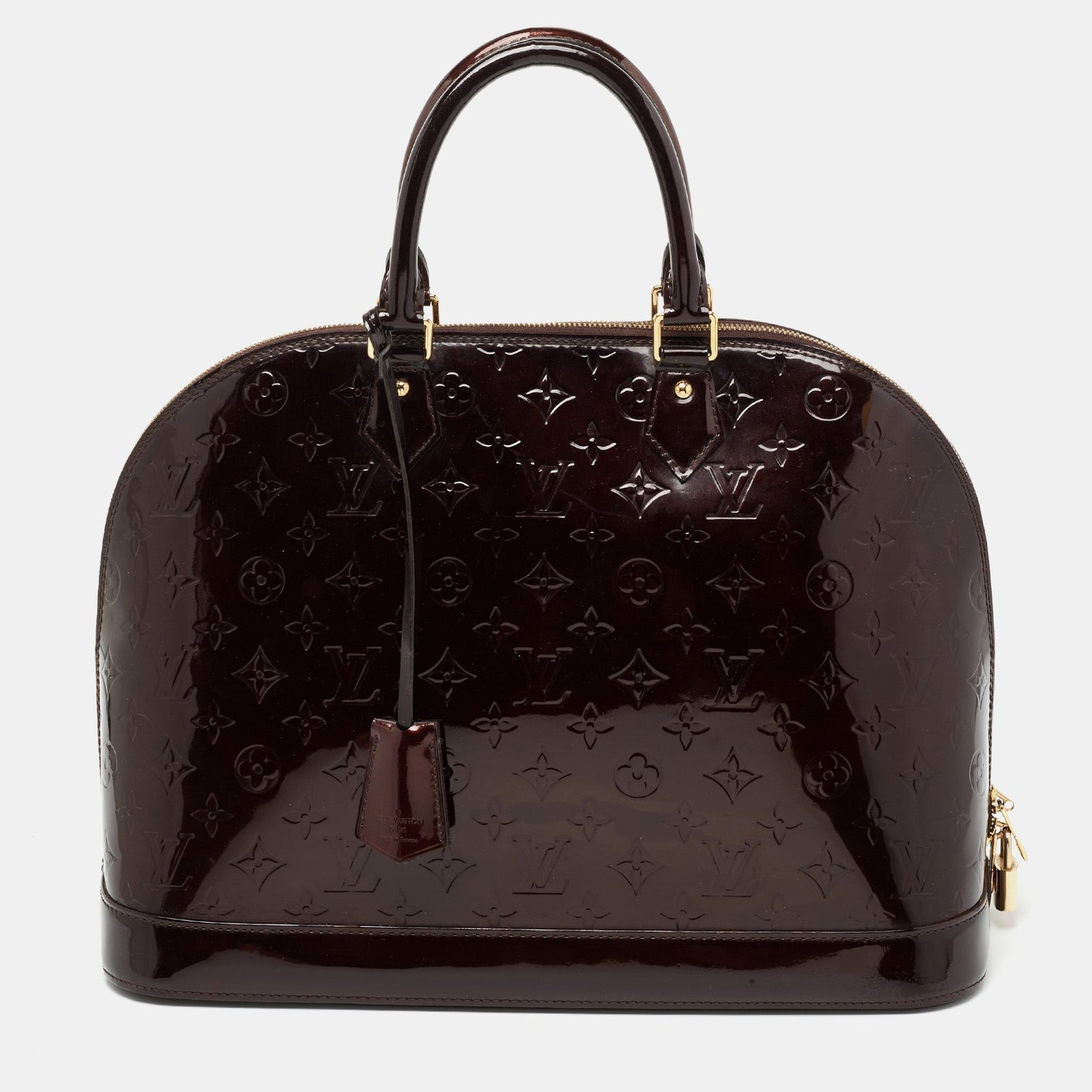 Introduced by Gaston Louis Vuitton in 1934 the Alma is defined by elegant curves and notable features. From one of the most iconic collections of Louis Vuitton this GM bag is imbued with exquisite craftsmanship and historic details. Constructed from Amarante Monogram Vernis patent leather it displays dual top handles gold tone hardware and a padlock. The fabric lined interior of the bag is secured by a zipper closure at the top.