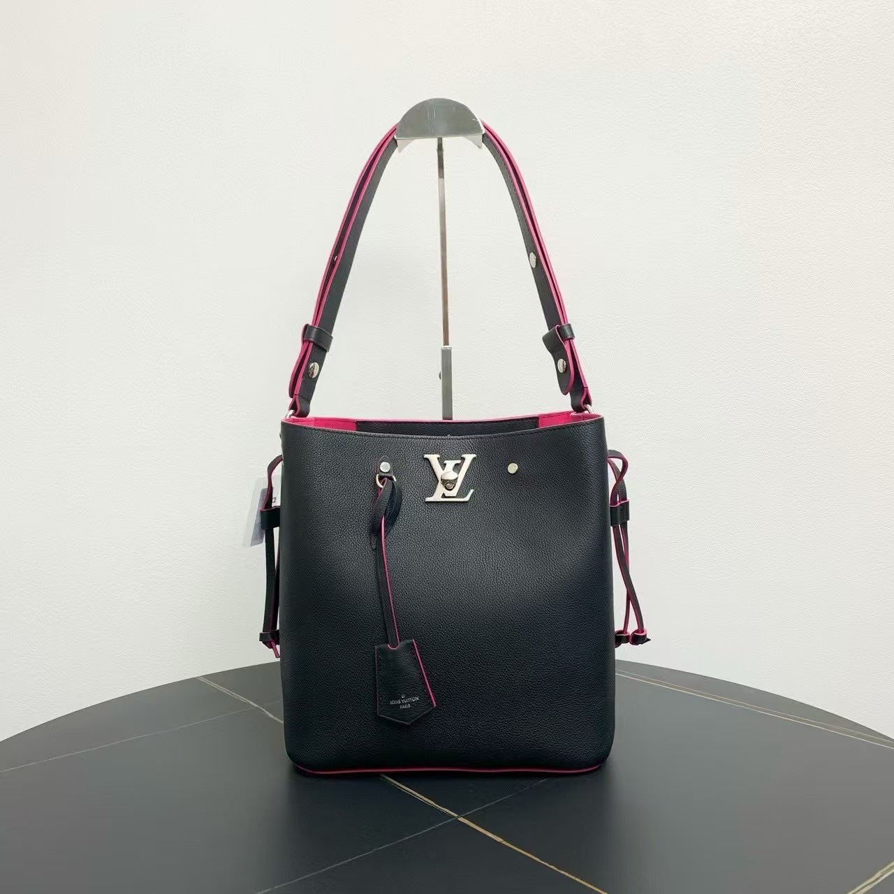 This authentic used Louis Vuitton Bucket Bag, in sleek black and vibrant pink leather, is a stunning piece for any collection. With its eye-catching LV logo and sturdy leather handles, this bucket bag combines elegance with everyday practicality. The pink canvas interior provides a lively contrast and ample space, making it perfect for daily use or special occasions. Ideal for collectors and those who adore vintage Louis Vuitton bags, this item is a standout among used designer handbags.