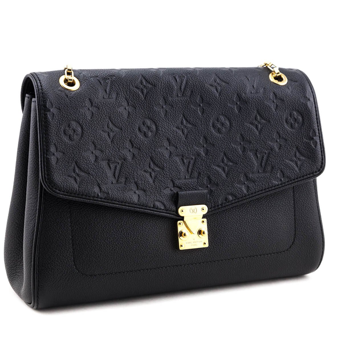 This authentic preloved Louis Vuitton Saint Germain MM offers an understated and elegant silhouette in a perfect neutral hue. Constructed of a black grained leather with the LV monogram debossed (Empreinte) at the flap, this preowned Louis Vuitton bag contrasts its stark hue with gold-tone hardware. The sliding chain-link strap can be doubled to wear on-shoulder, or worn at-length to carry as a longer crossbody bag. Anchoring in a push-lock closure, the envelope-shaped flap lifts to reveal one slip pocket at the front wall, as well as the tonal microfiber-lined interior; therein featuring two open compartments with one zippered pocket at the rear wall. This Louis Vuitton Black Monogram Empreinte Saint Germain MM is a coveted pick that won’t be available for long!
